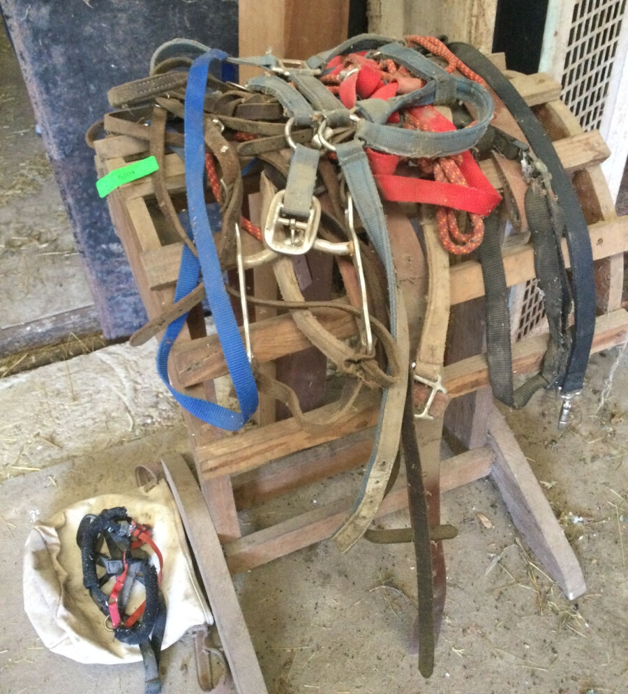 Includes a variety of horse tack, straps, and related items. Also includes a wooden stand that the items are displayed on.