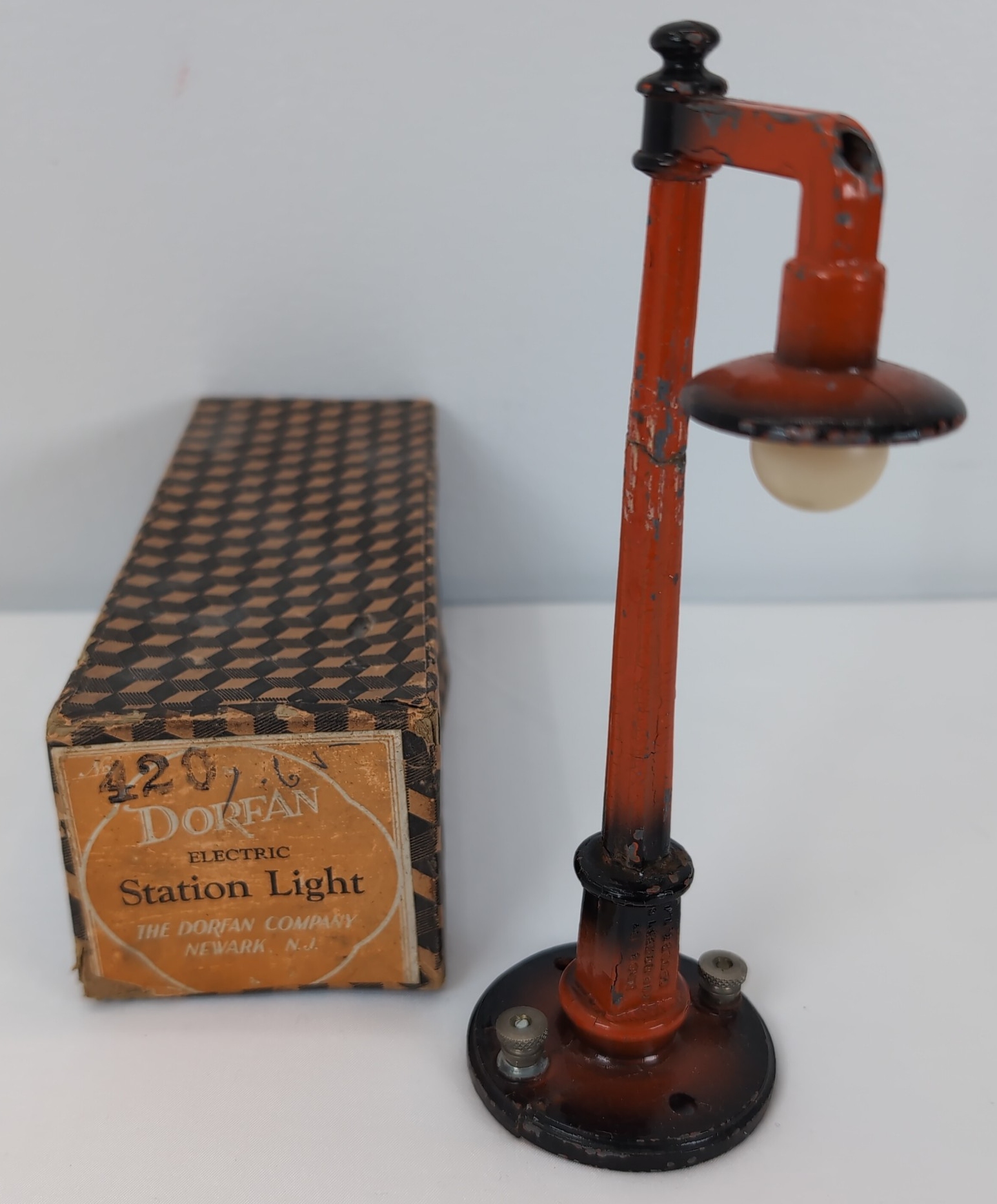 Dorfan Electric Station Light toy railroad accessory with original box. The light is in original orange and black paint with repaired damage to base and column. The box is very square, very solid and shows very light wear. Some overall age fading. 420 is ink stamped with numbers written in ink to label. Other than noted damage, lamp/light looks original C6.