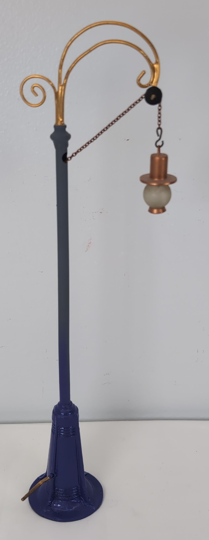 Prewar Bing 1/Wide Gauge street lamp with chain and crank handle for raising and lowering lamp. Beautifully restored to look C9. Lamp measures approximately 13-1/4 inches tall at highest point.