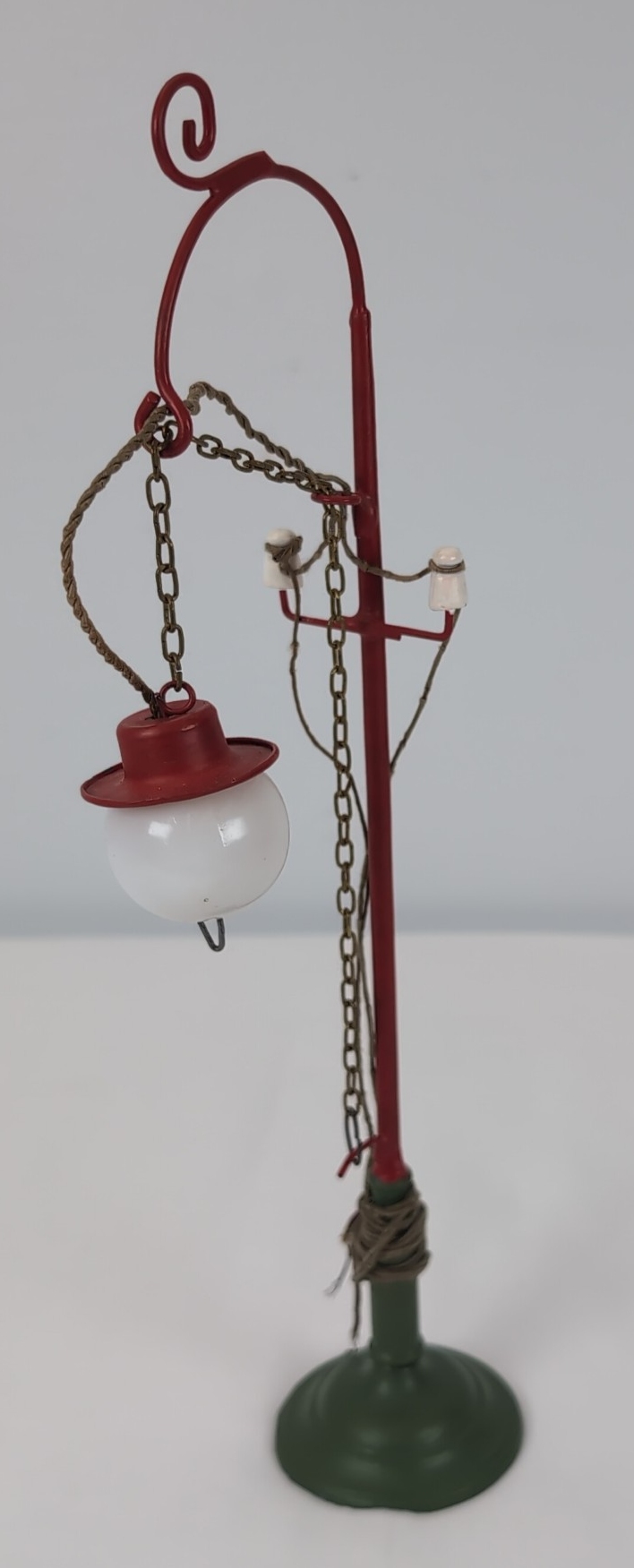 Prewar Karl Bub 1/Wide Gauge electrified street lamp with chain and crank handle for raising and lowering lamp. Lamp retains a nice length of cloth wrapped wiring in what appears to be newer condition. Accessory has been very nicely restored to look C7-8 with a couple tiny and very minor paint chips. Accessory is approximately 11-1/4 inches tall at highest point.