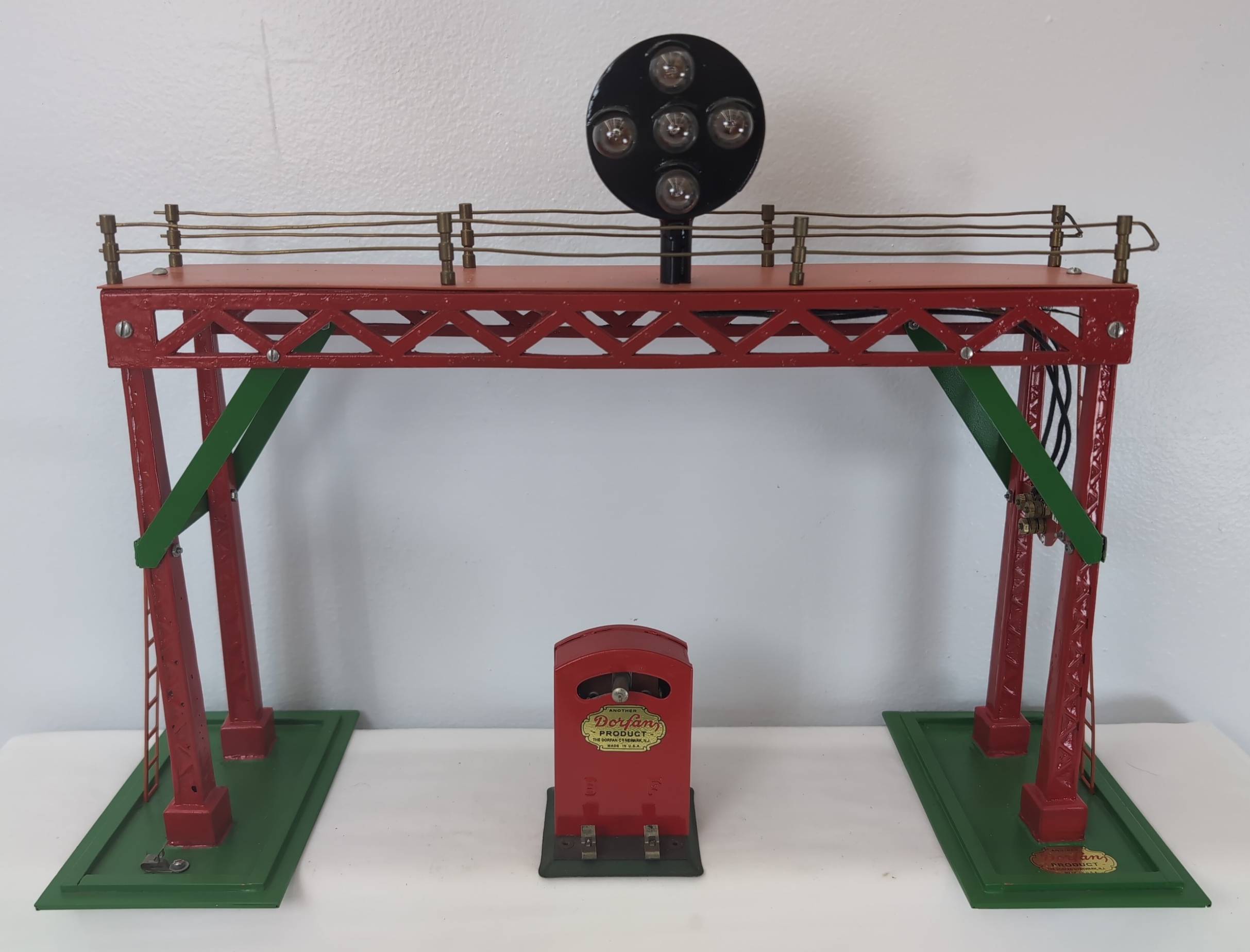 Prewar Dorfan O/Standard Gauge No. 118 Overhead Signal Bridge and Controller. Accessory is marked "PTL Dorfan 2007 Reproduction" and was made by a 25 year collector of Dorfan to the exact dimensions and colors of an original. Controller is restored. Accessory and controller look C9.