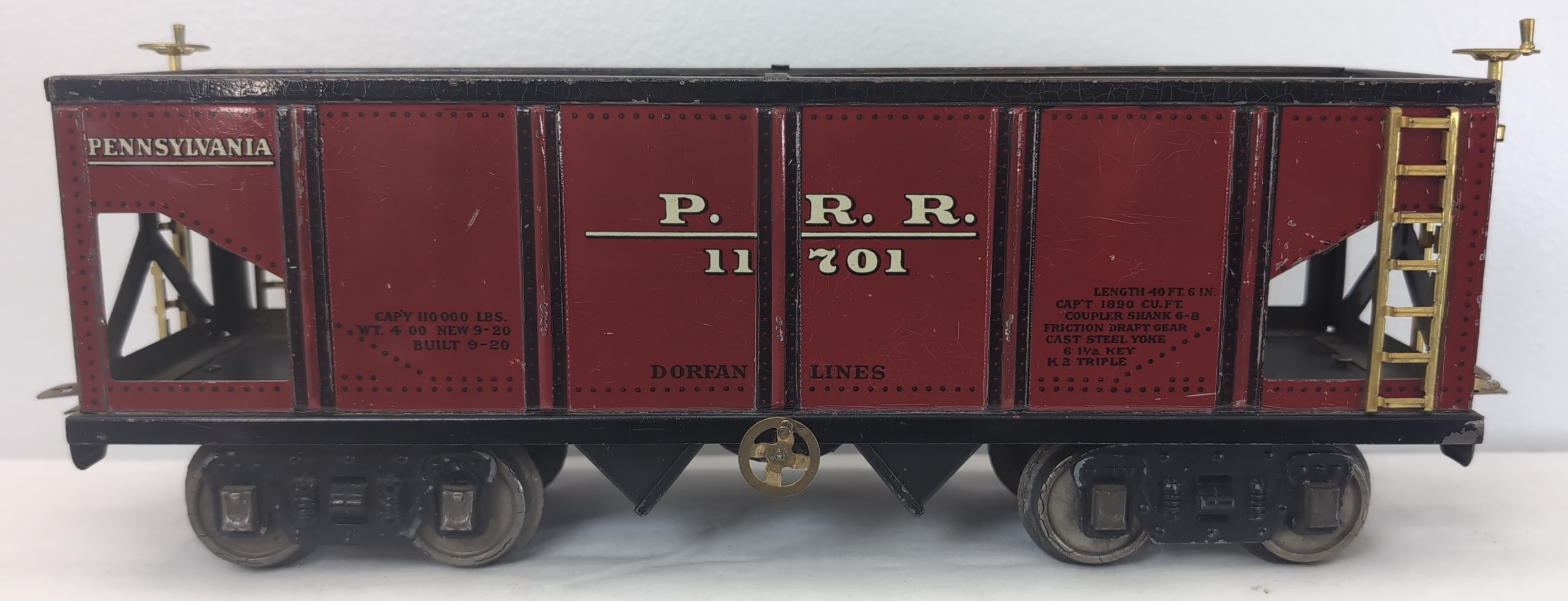 Prewar The Dorfan Lines Wide/Standard Gauge No. 805 Pennsylvania PRR 11701 hopper car with older touchups to red, otherwise original C7. Original trucks and wheels. Wheels look great with minor fatigue and flakes/chips to flanges.