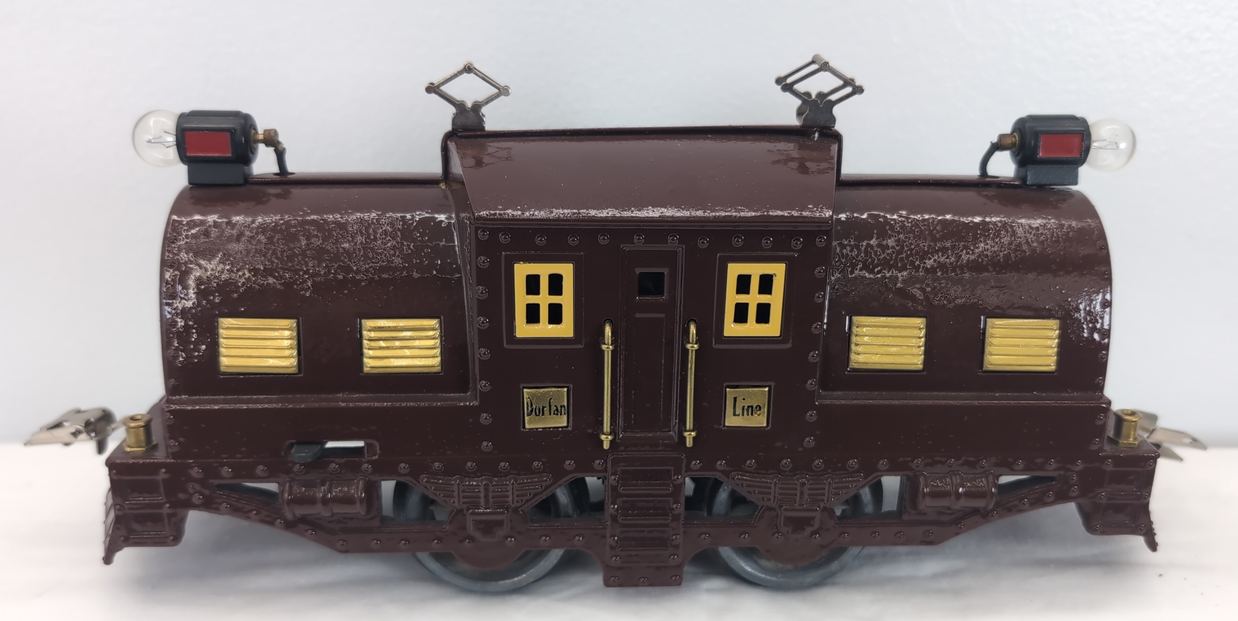Prewar Dorfan Wide/Standard Gauge 1930 No. 3920 maroon with yellow windows Whaleback electric die-cast locomotive, fantastically restored to look C8-9 with just a tiny bit of run time on rollers. Wheels turn freely, motor spins, untested.