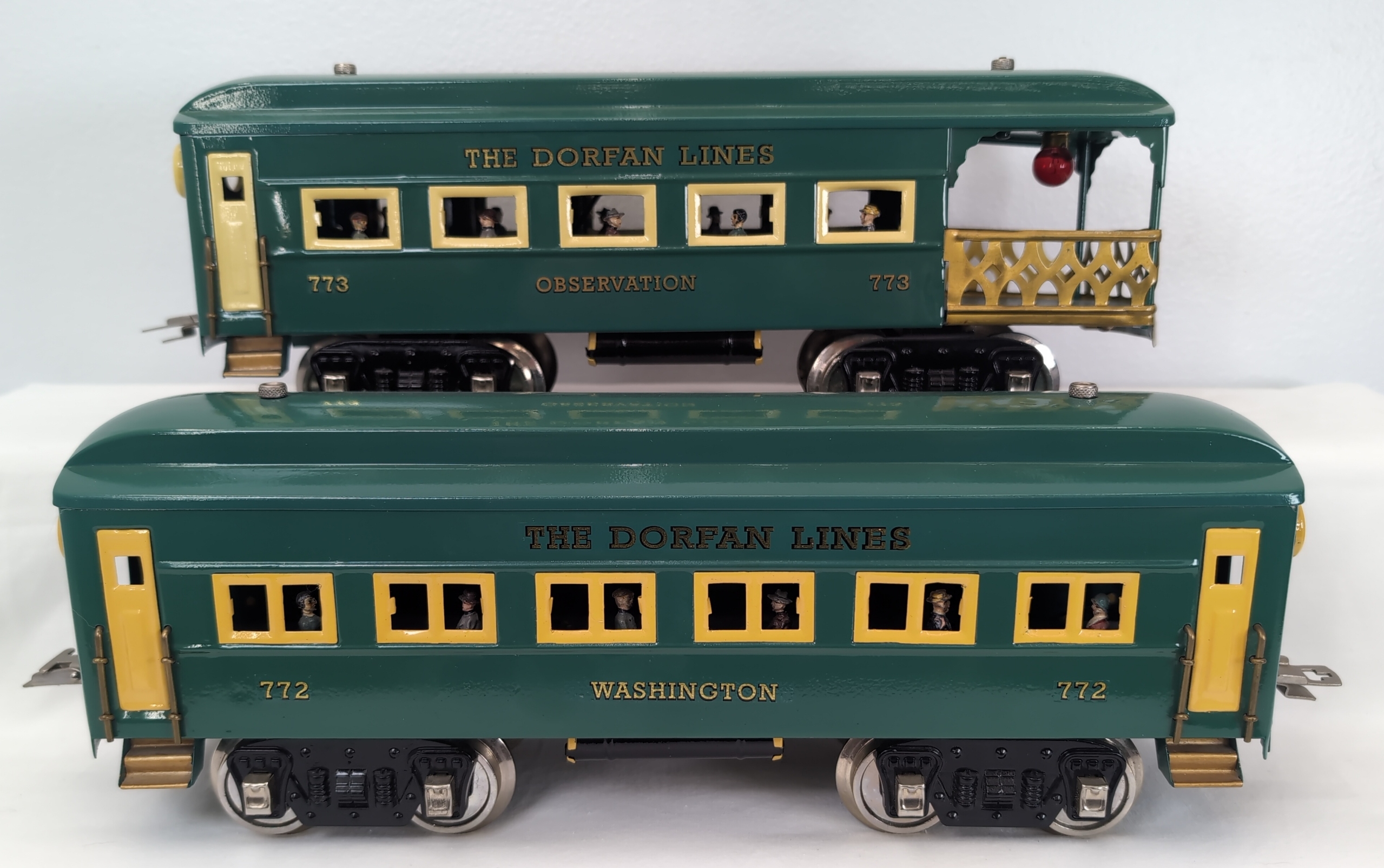 Prewar Dorfan Lines Wide/Standard Gauge No. 992/772 Washington coach in blue with yellow windows and doors with (passenger figures) & No. 993/773 Observation in blue with buff windows and doors, passenger cars beautifully restored to look C8-9. Trains were catalog number 992 and 993 but have 772 and 773 decals.