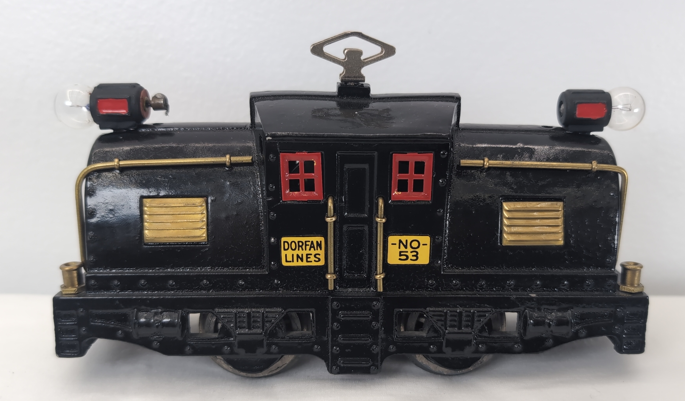 Prewar Dorfan O/Narrow Gauge No. 53 electric locomotive, very tiny paint chips, run time on wheels and rollers. Train looks beautifully restored C7++. Some wheels move, and some do not.