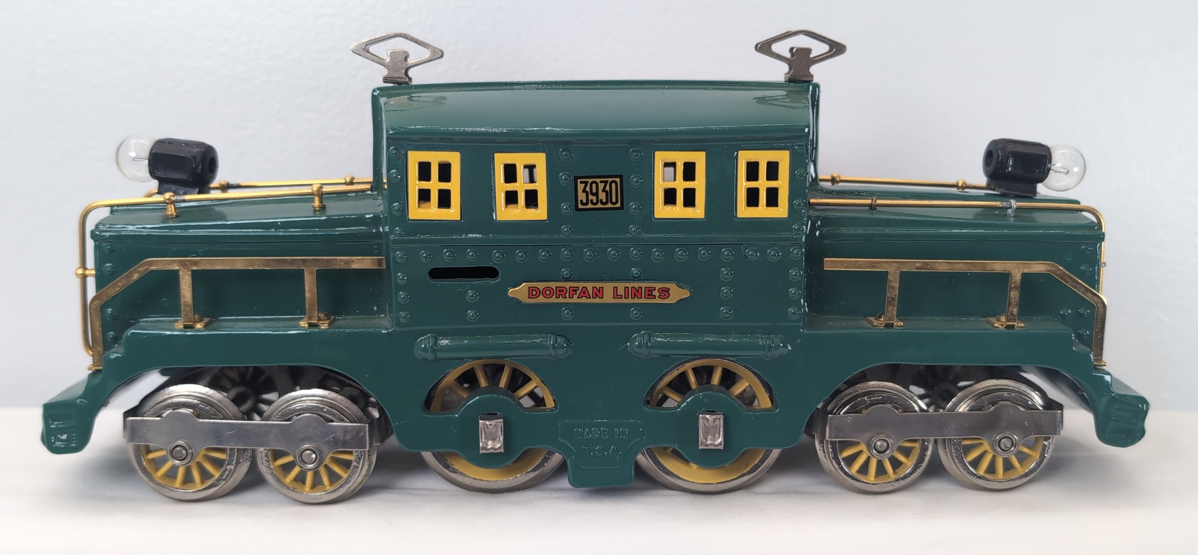 Prewar Dorfan Lines Wide/Standard Gauge 3930 blue with yellow trim electric "Crocodile" locomotive 1928-1929, beautifully restored to look fantastic C7++ with a couple minor tiny paint nicks. Train has no internals.