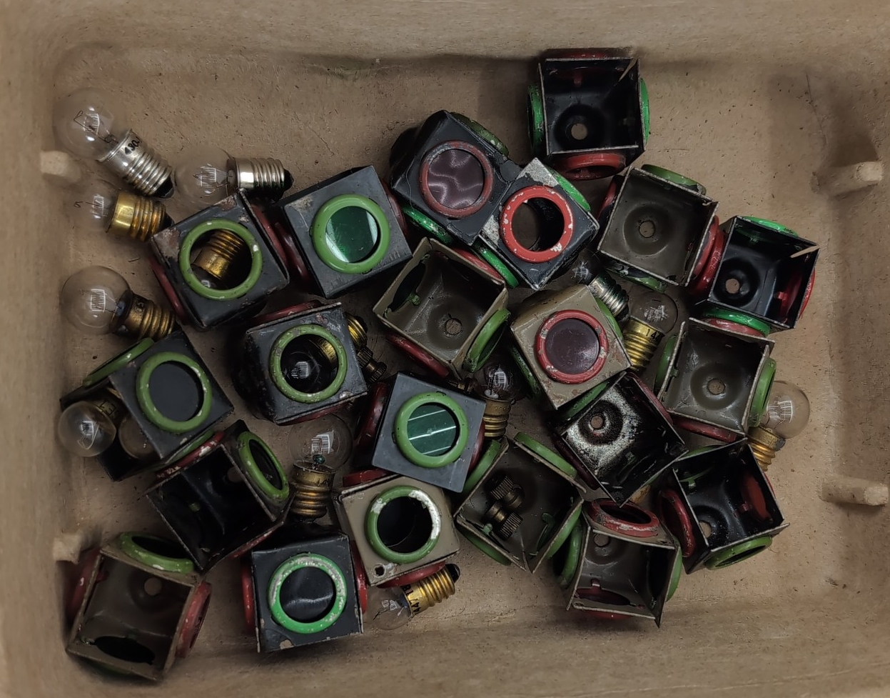 Twenty-one prewar lantern covers for Lionel standard gauge switches, fifteen lamps for switches and five binding post nuts. Fourteen lantern covers are black, seven are Mojave. All appear to be originals.