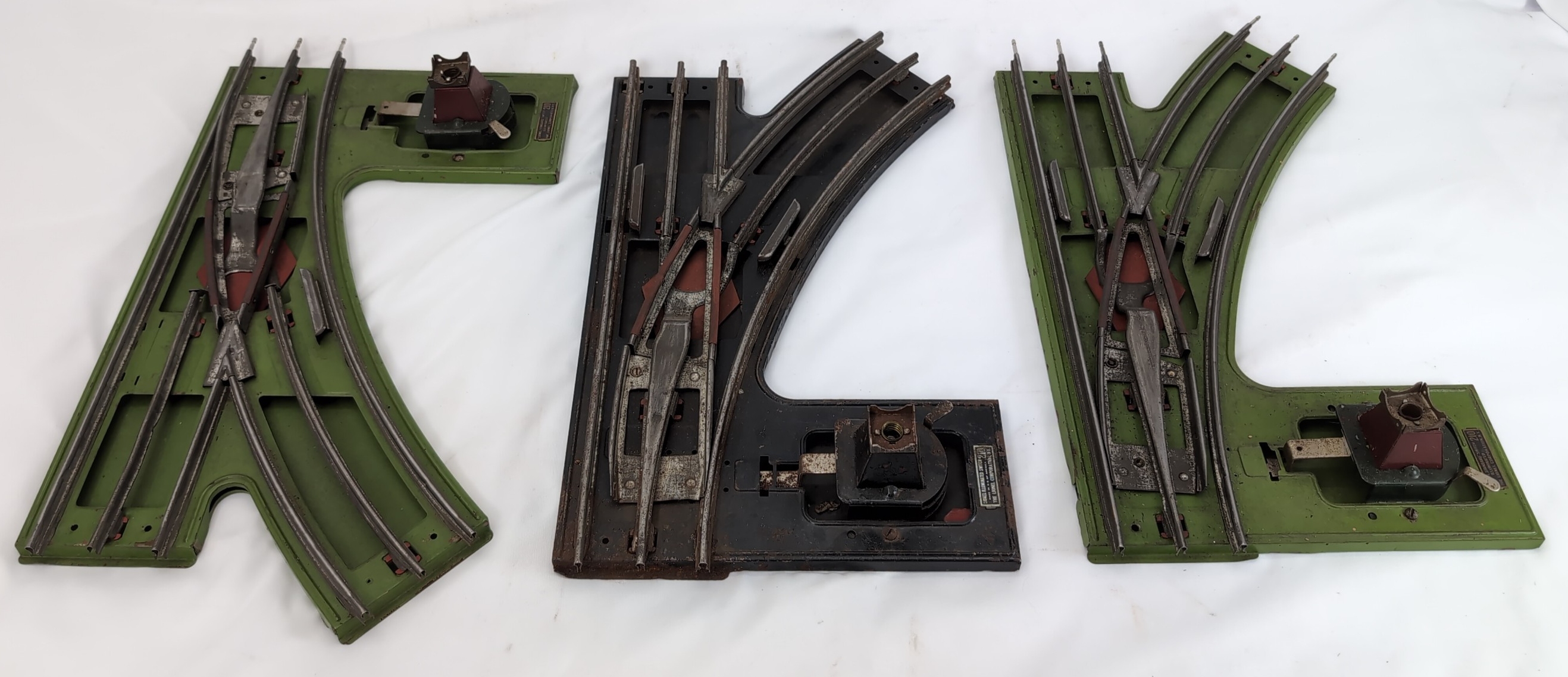Two right hand and one left hand prewar Lionel 210 illuminated standard gauge switches, manual control. Two are a nicely matching pair in green and the other right hand is in black with rust and oxidation. Green switches are clean and look layout ready.