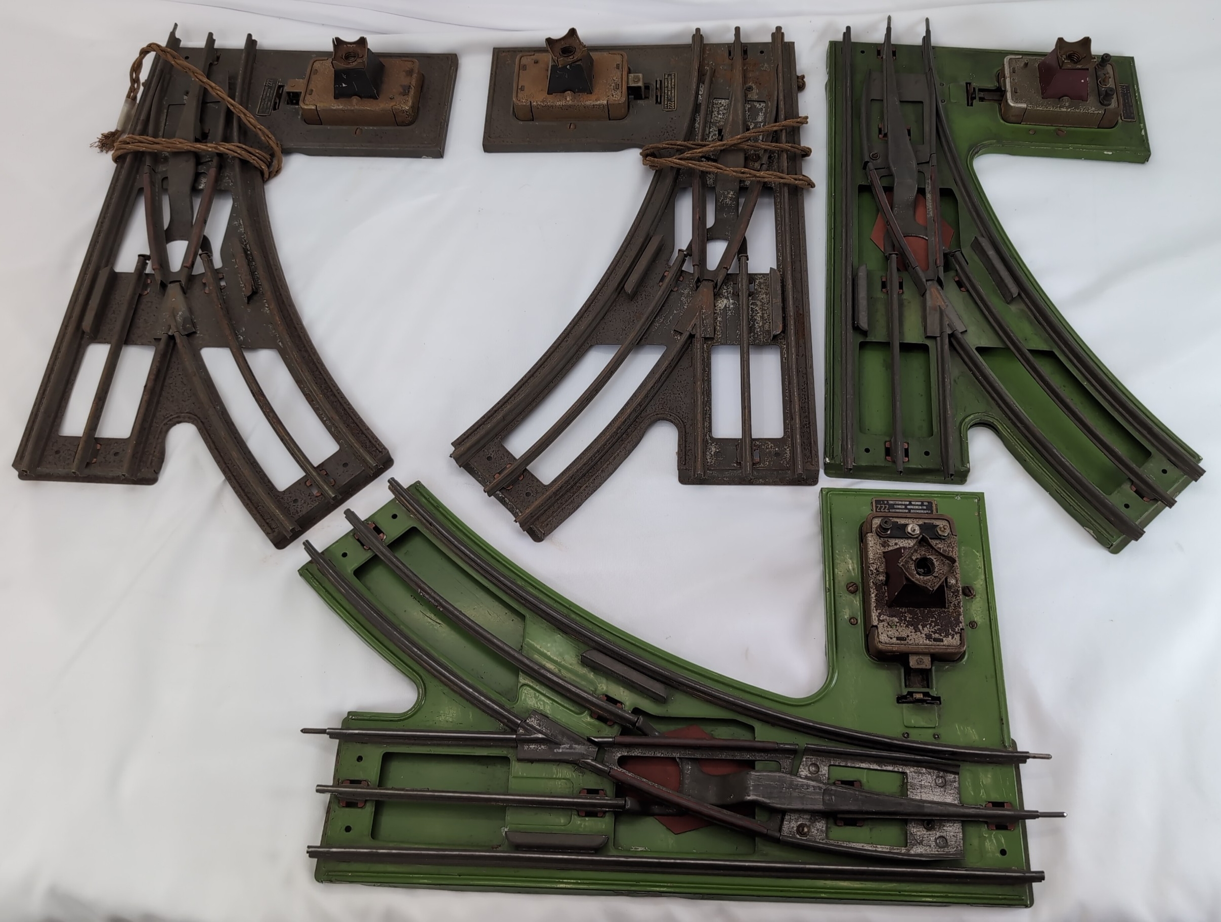 Two different pairs of prewar Lionel 222 illuminated Standard Gauge Remote Control switches, one pair has surface rust and oxidation with cloth wrapped cord. Other pair is painted with some surface rust and oxidation. Nice switches for an operating layout. Please view the photos for the best description of the items in this group.