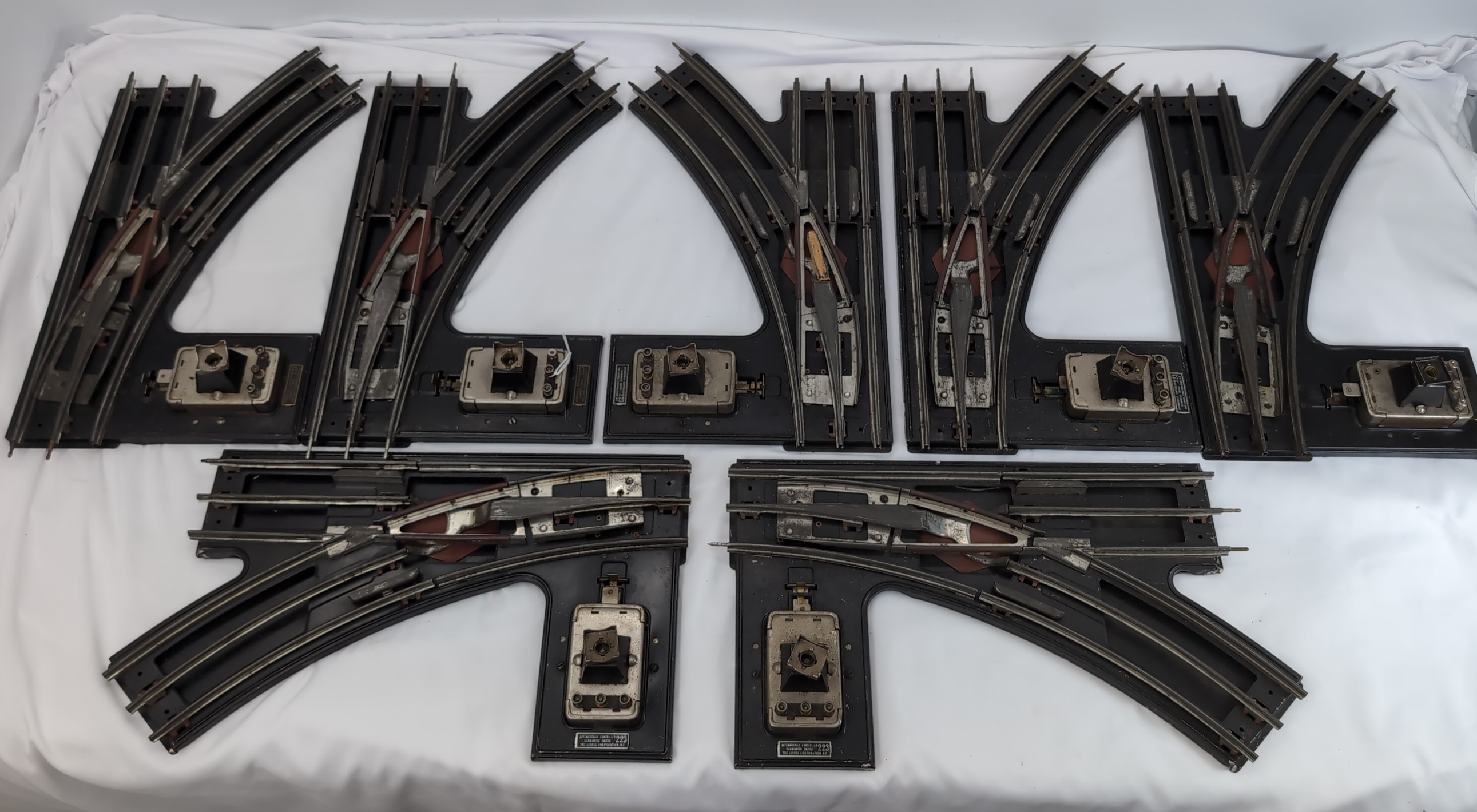 Five right hand turn out and two left hand turnout prewar Lionel 223 illuminated standard gauge Remote Control switches in black. One left hand turnout has a wooden piece of frog. Switches otherwise look clean and layout ready. Please view the photos for the best description of the items in this group.