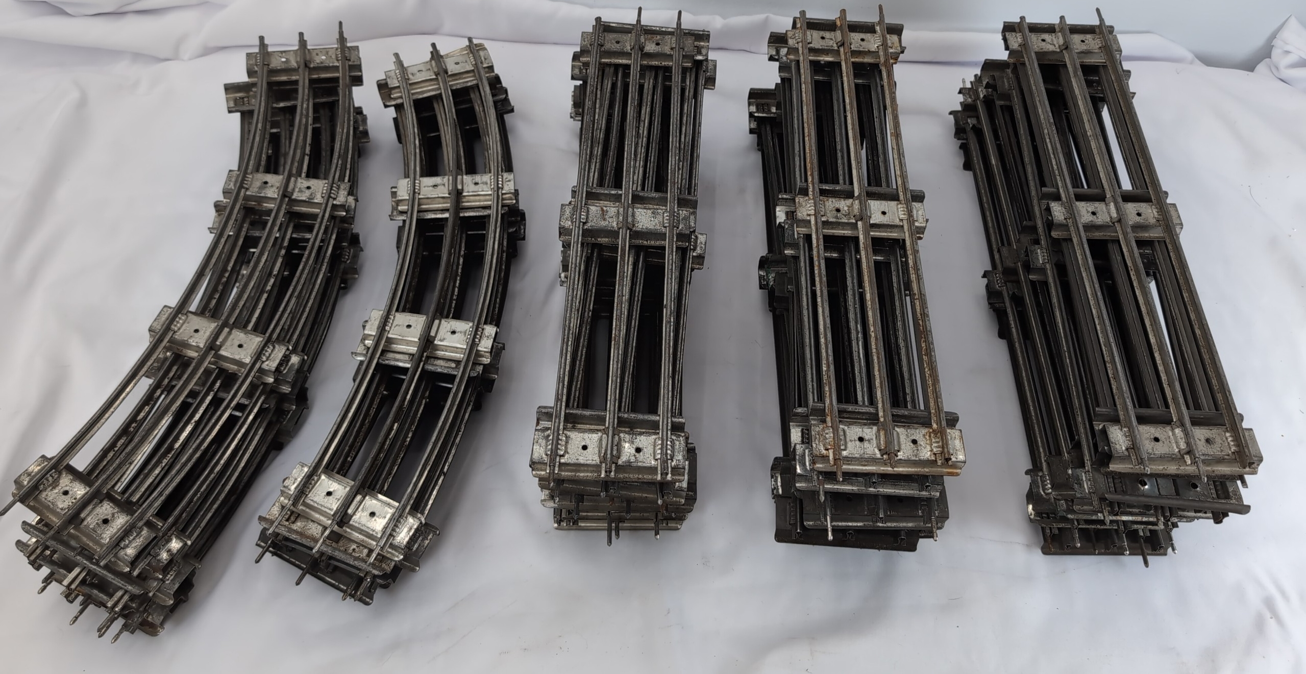 Prewar Lionel Standard Gauge track marked and unmarked section of both straight and curved. Twenty-three curved with four cross ties. Thirty-nine straight sections with three cross ties. Some minor spots of surface rust and oxidation on some sections of track. Track is overall clean and layout ready.