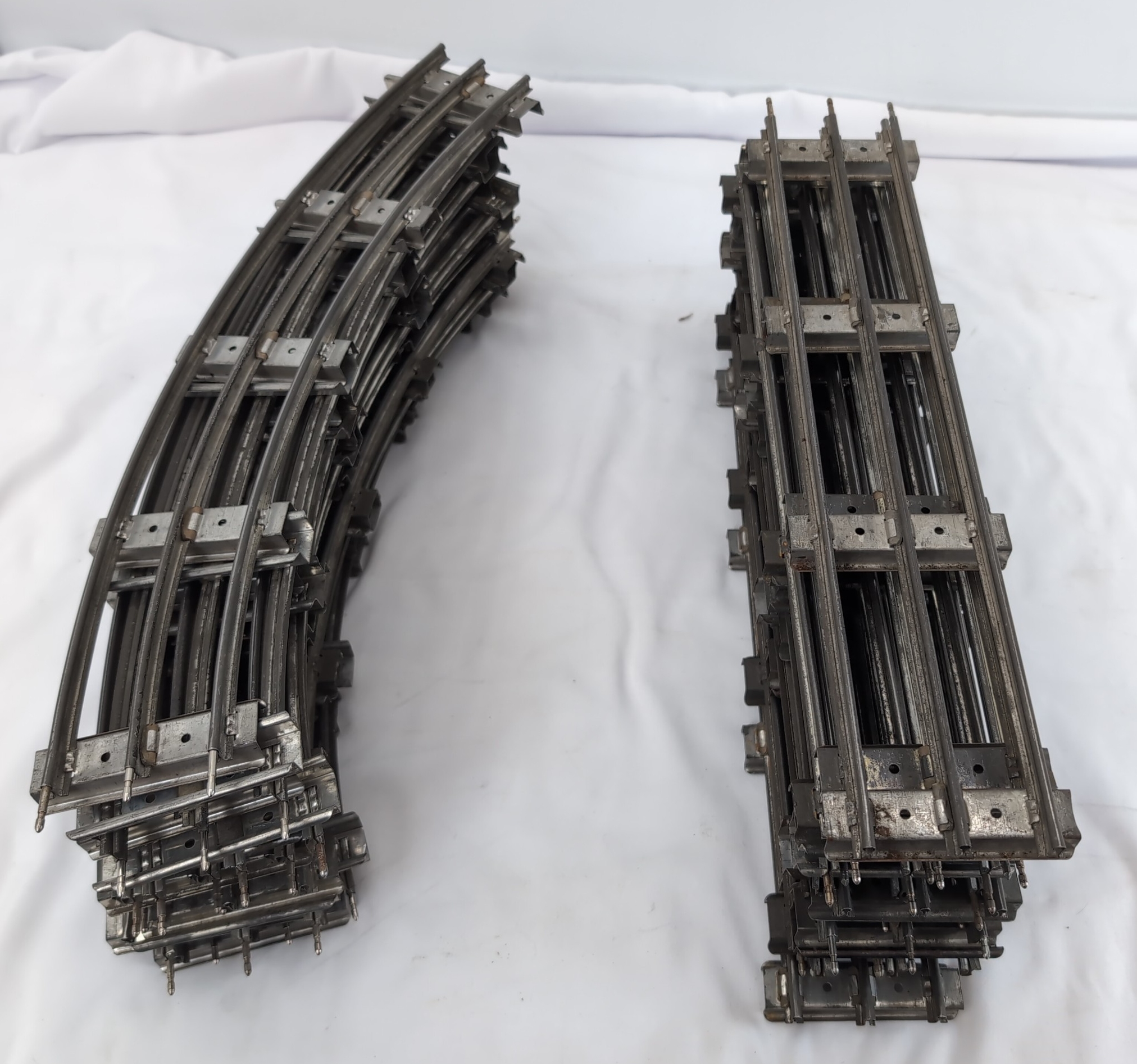 Unmarked prewar Standard Gauge sections of track, clean and layout ready. Some sections have some rust, some have some oxidation. Great lot of track to extend your layout with. Fourteen straights with four ties and thirteen curved sections with five ties.