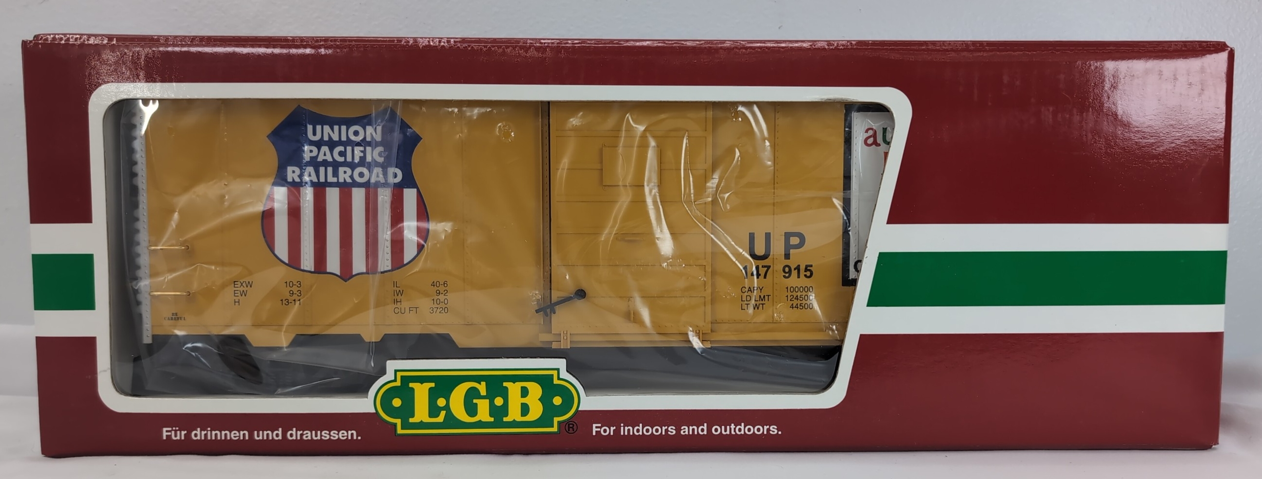 Modern Era LGB G Scale 47915 UP Union Pacific 147915 box car in original box, C9-10. Box shows little wear, bright, clean, square and solid.