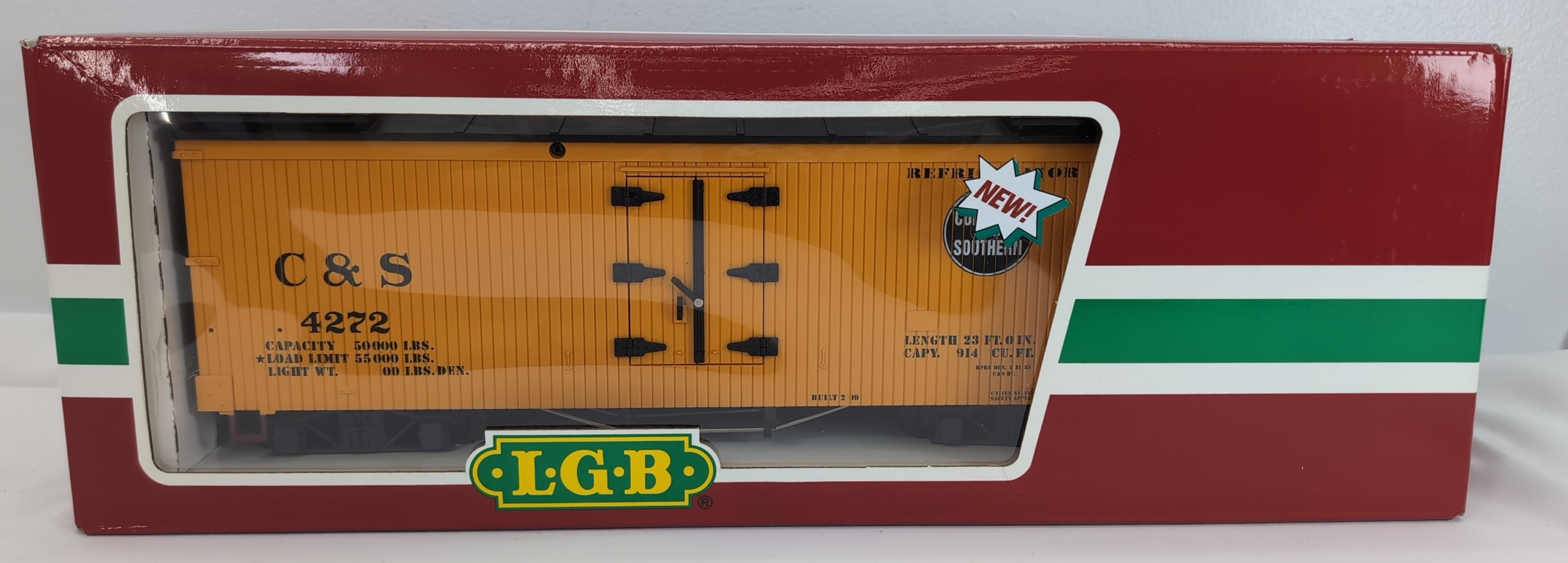 Modern Era LGB G Scale 42720 C&S Colorado and Southern box car in original box with sleeve. Train looks C9-10. Box shows no wear, bright, clean, square and solid.