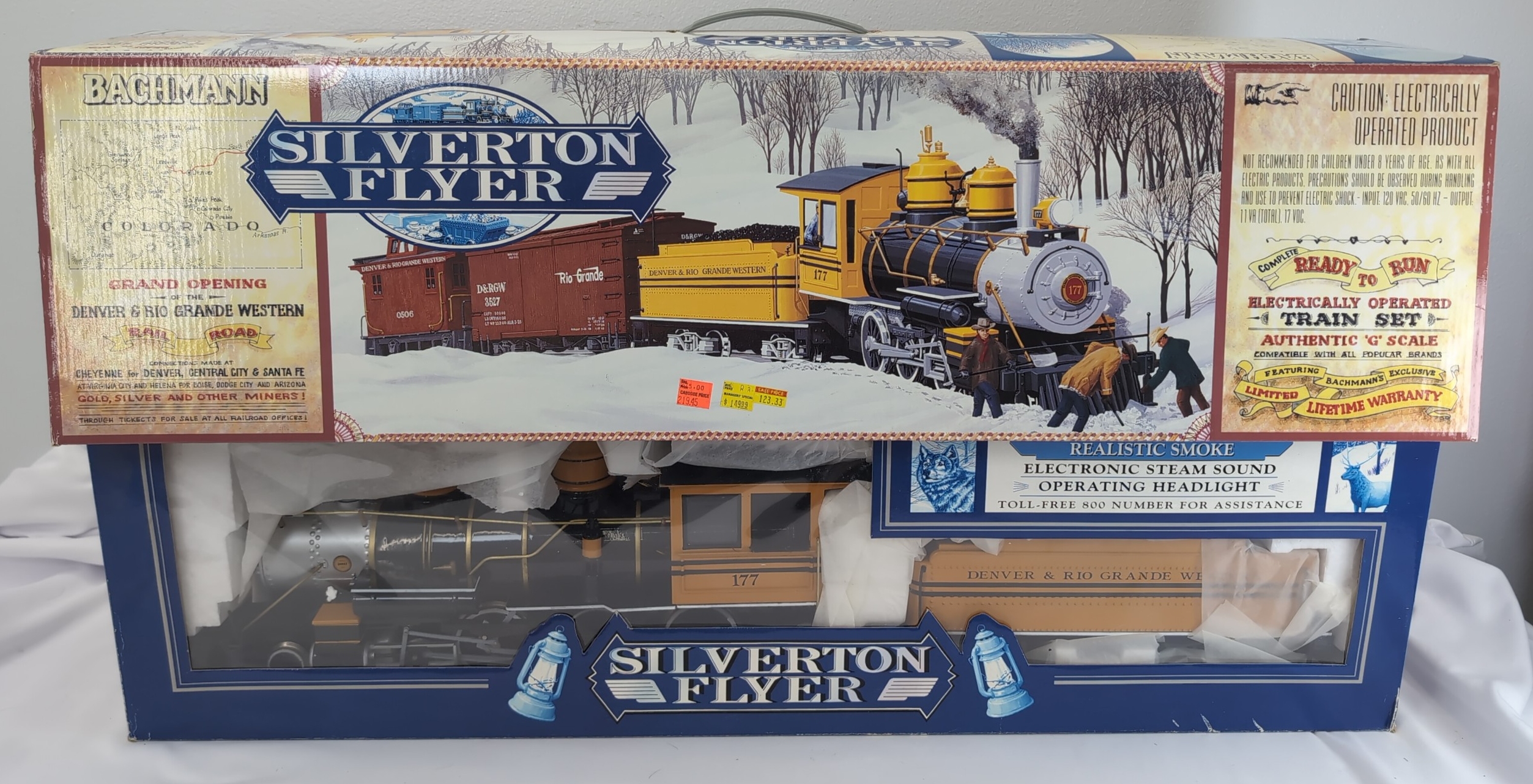 Bachmann 90025 Silverton Flyer G Scale set in box, never opened assumed C10. Box shows light wear, price stickers. Factory taped shut ends.