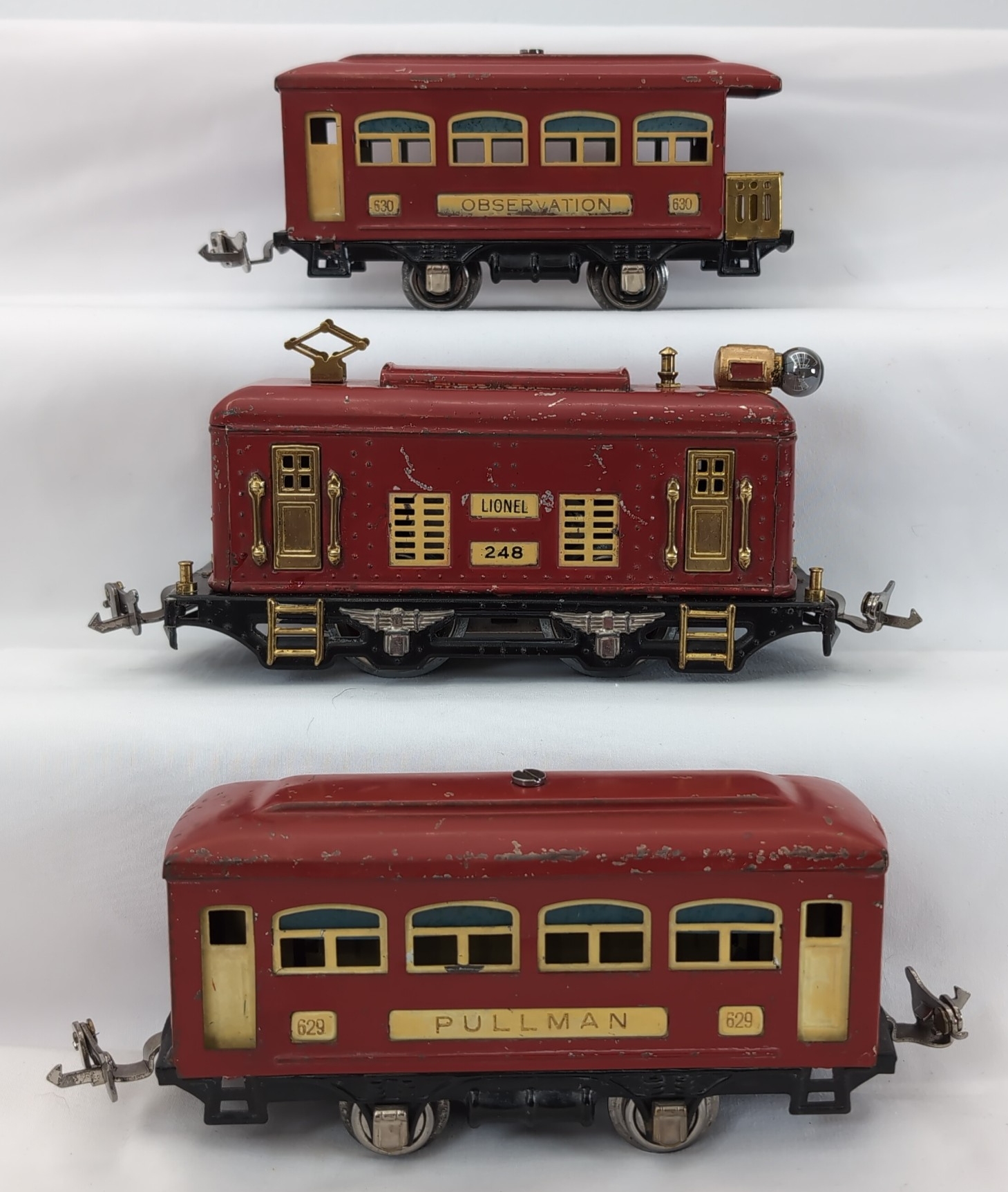 Prewar Lionel O Gauge 248 box cab electric locomotive with 629 Pullman and 630 Observation in Red and Cream, nickel journals, passenger train C6.
