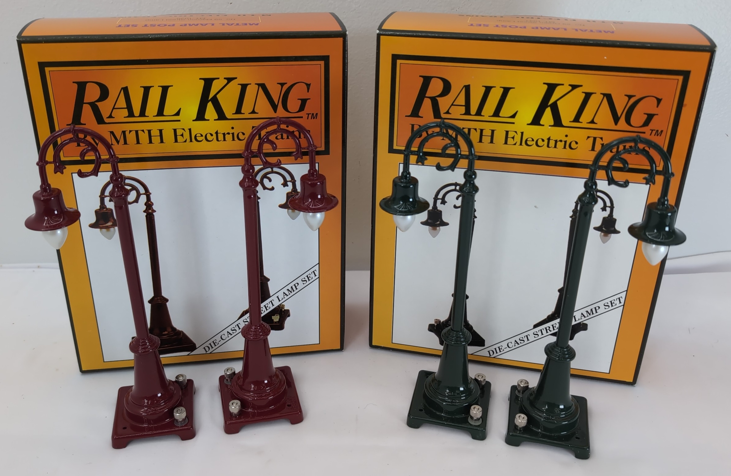 MTH Lionel No. 59 maroon MT-1030 and green MT-1031 O/Standard Gauge Street Lamp sets in original boxes, C9-10. Boxes have a price sticker, no wear, bright, clean, square and solid.