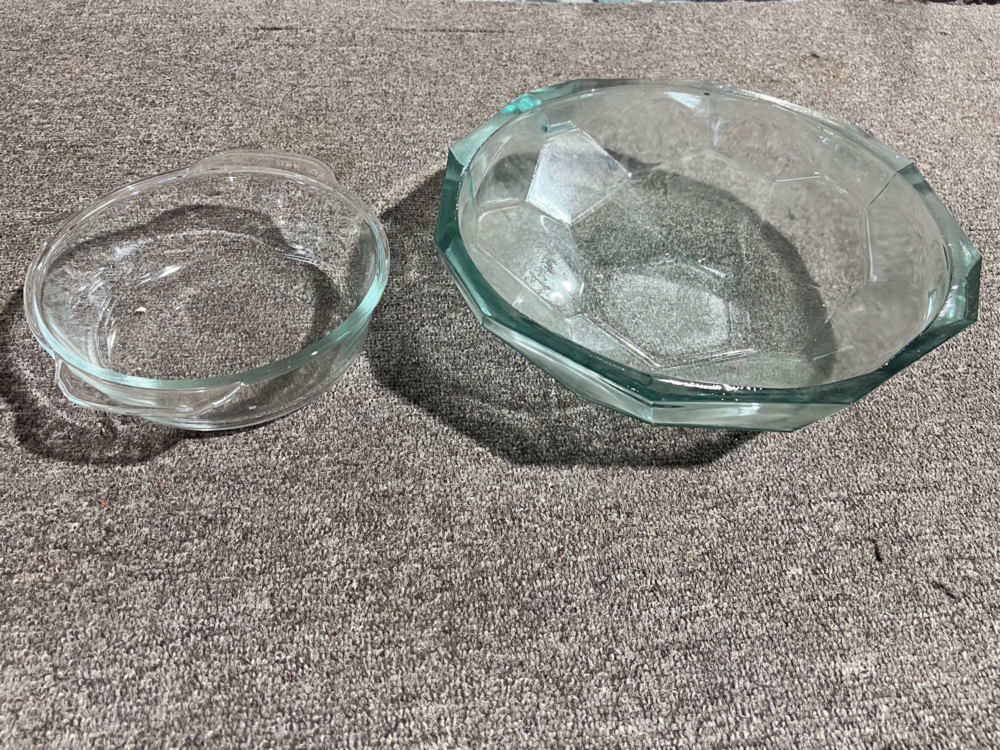 Decorative glass centerpiece bowl with geodesic design, there are two small chips on the edge, also includes a round oven proof casserole dish, no lid, see pictures for details.
