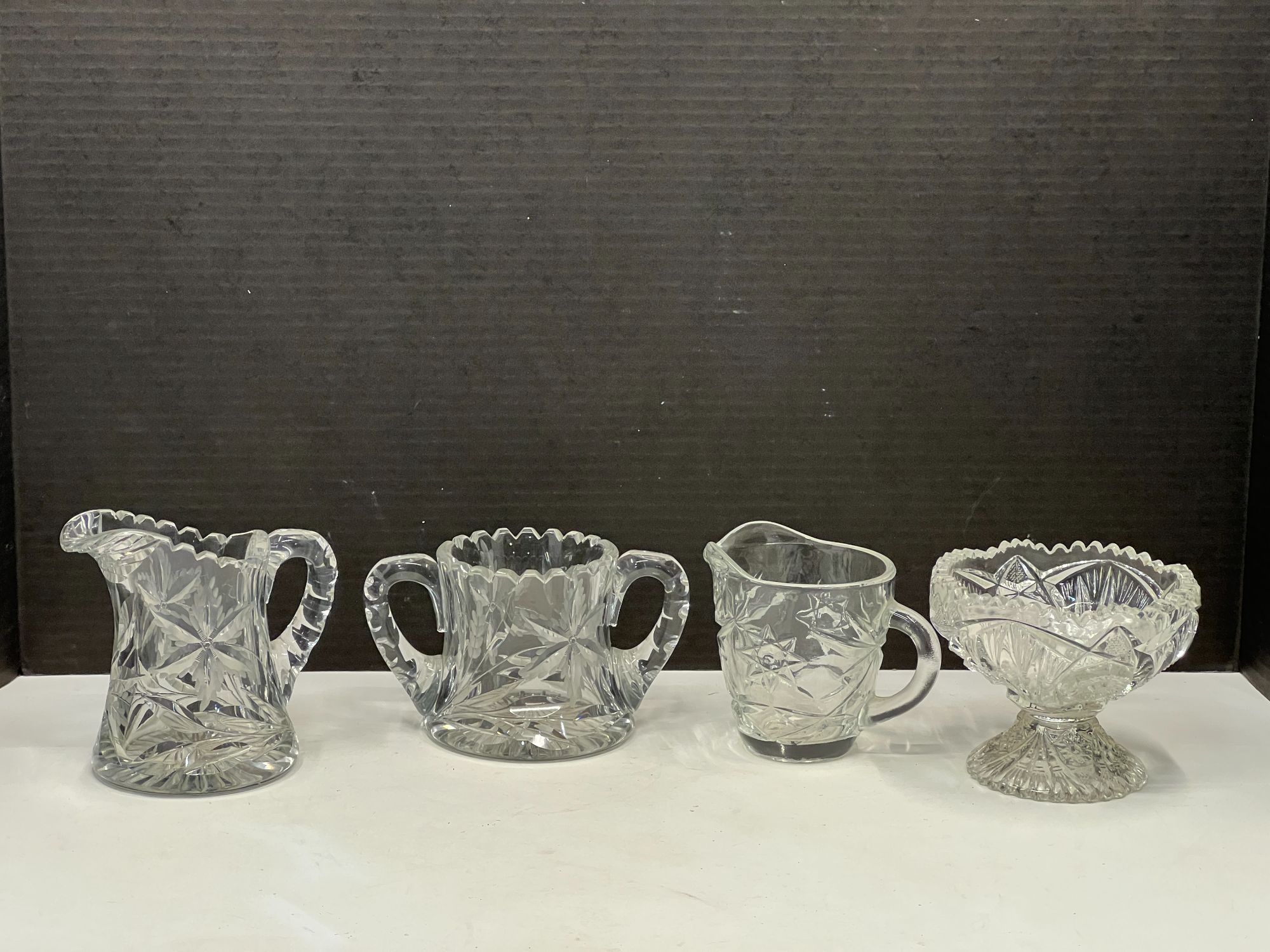 Beautiful crystal sugar and creamer, believe to be EAPG crystal, also includes a small footed, sawtooth edge compote, and more. Four pieces total, see pictures for details.