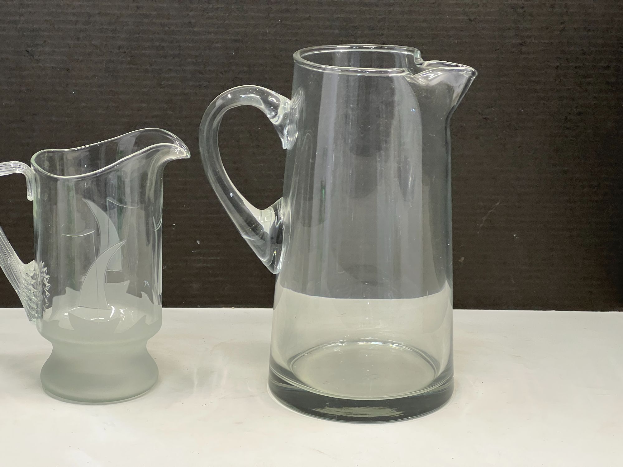 Clear glass pitcher, also includes a small glass pitcher with frosted bottom and sailboat motif, see pictures or details.