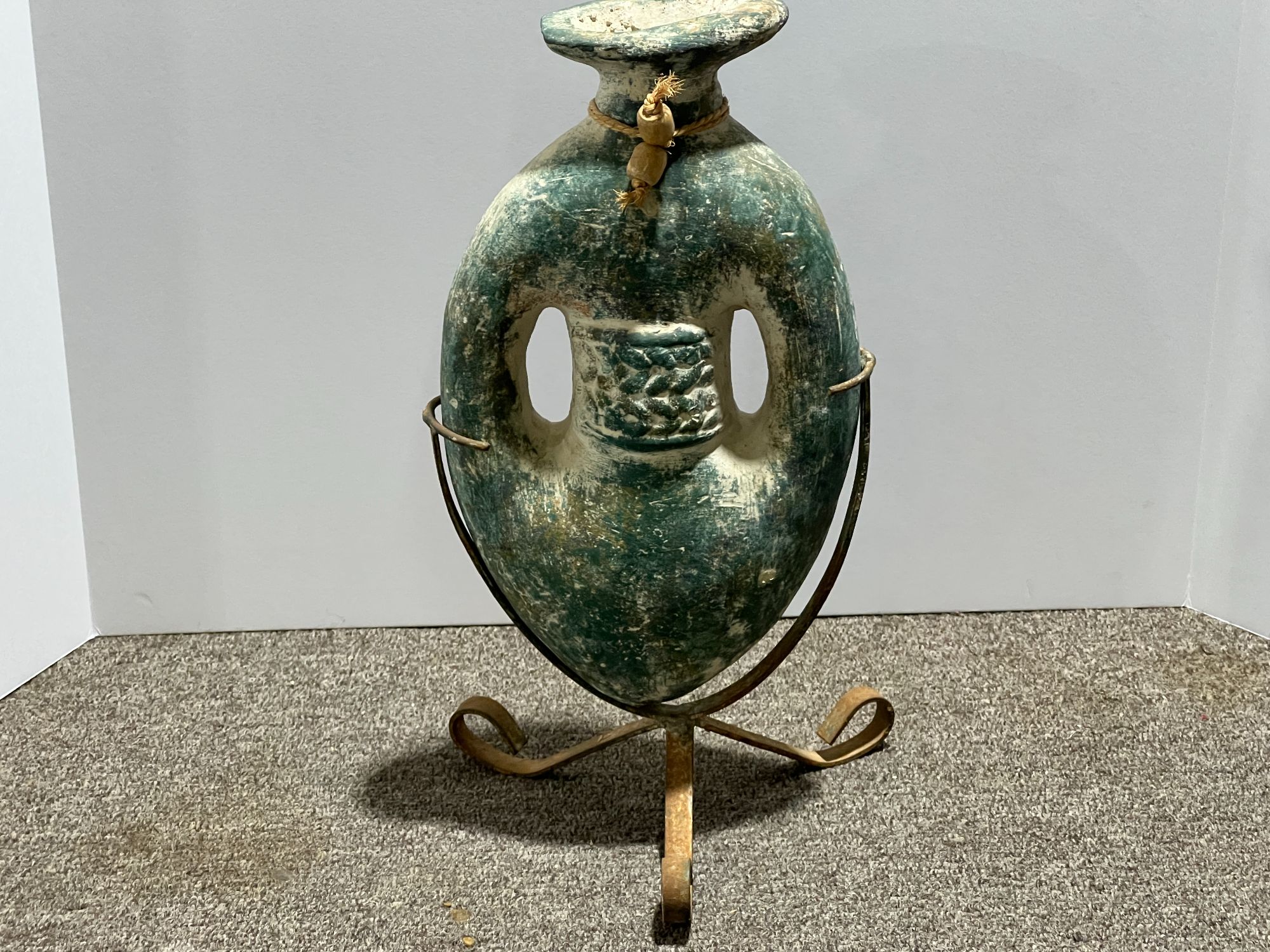 Earthenware, amphora style vase with holder, see pictures for details.