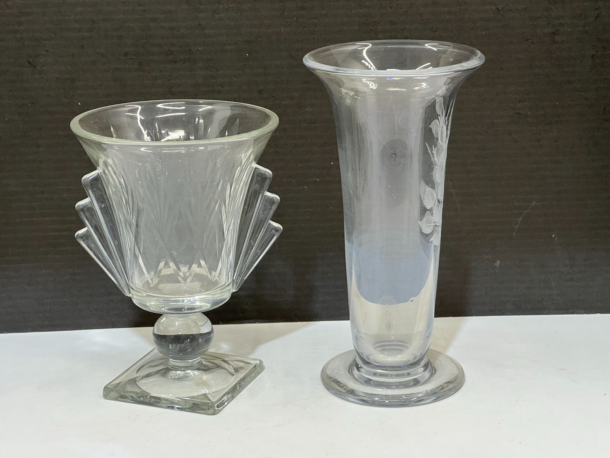 Vintage Webb England crystal vase with etched floral motif, also includes a lovely art deco vase, this piece has a very fine crack, see pictures for details.