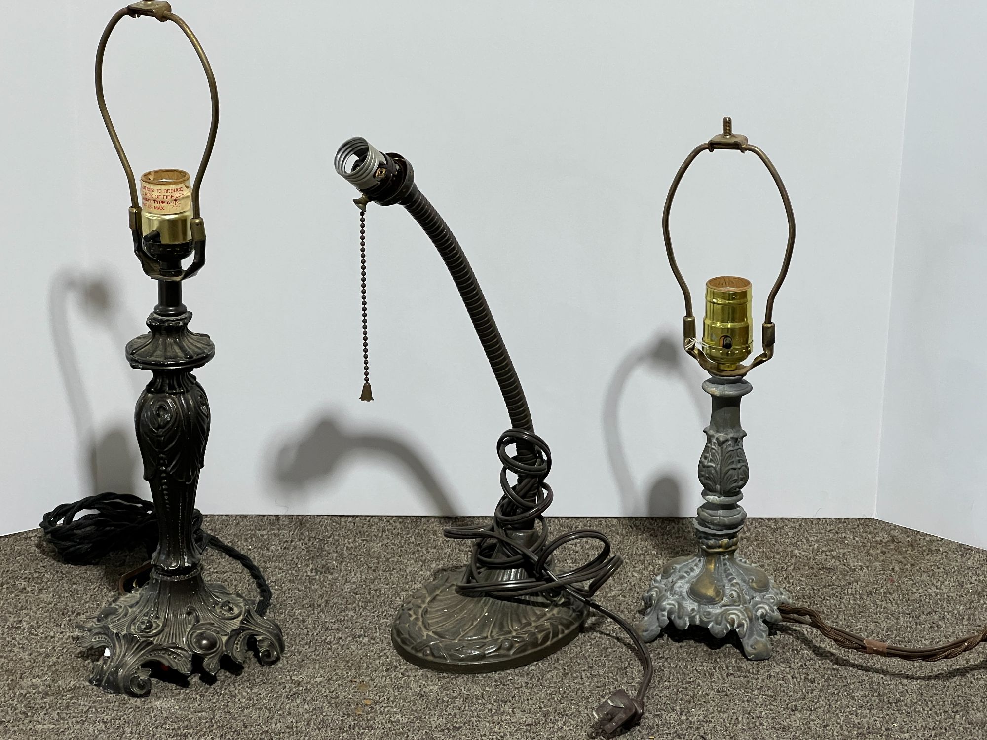 Vintage cast metal lamps, three pieces, includes one adjustable head lamp, see pictures for details.