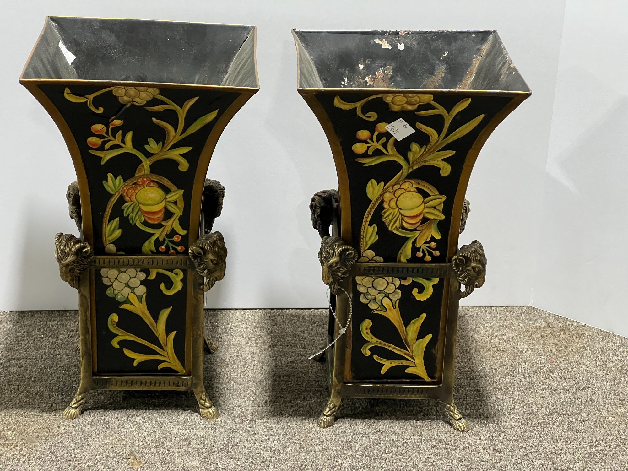 Vintage metal planters with holders, set of two, these pieces have painted fruit motif, some of the paint is starting to peel, see pictures for details.