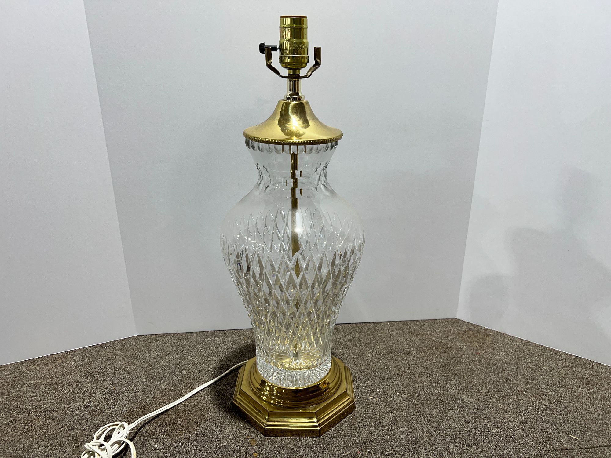 Vintage glass urn lamp with brass accents,, has a cut diamond pattern, see pictures for details.