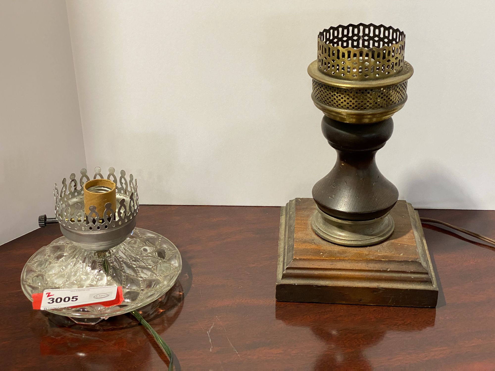 Electric hurricane lamps, two pieces, one glass based and one wood based, see pictures for details.