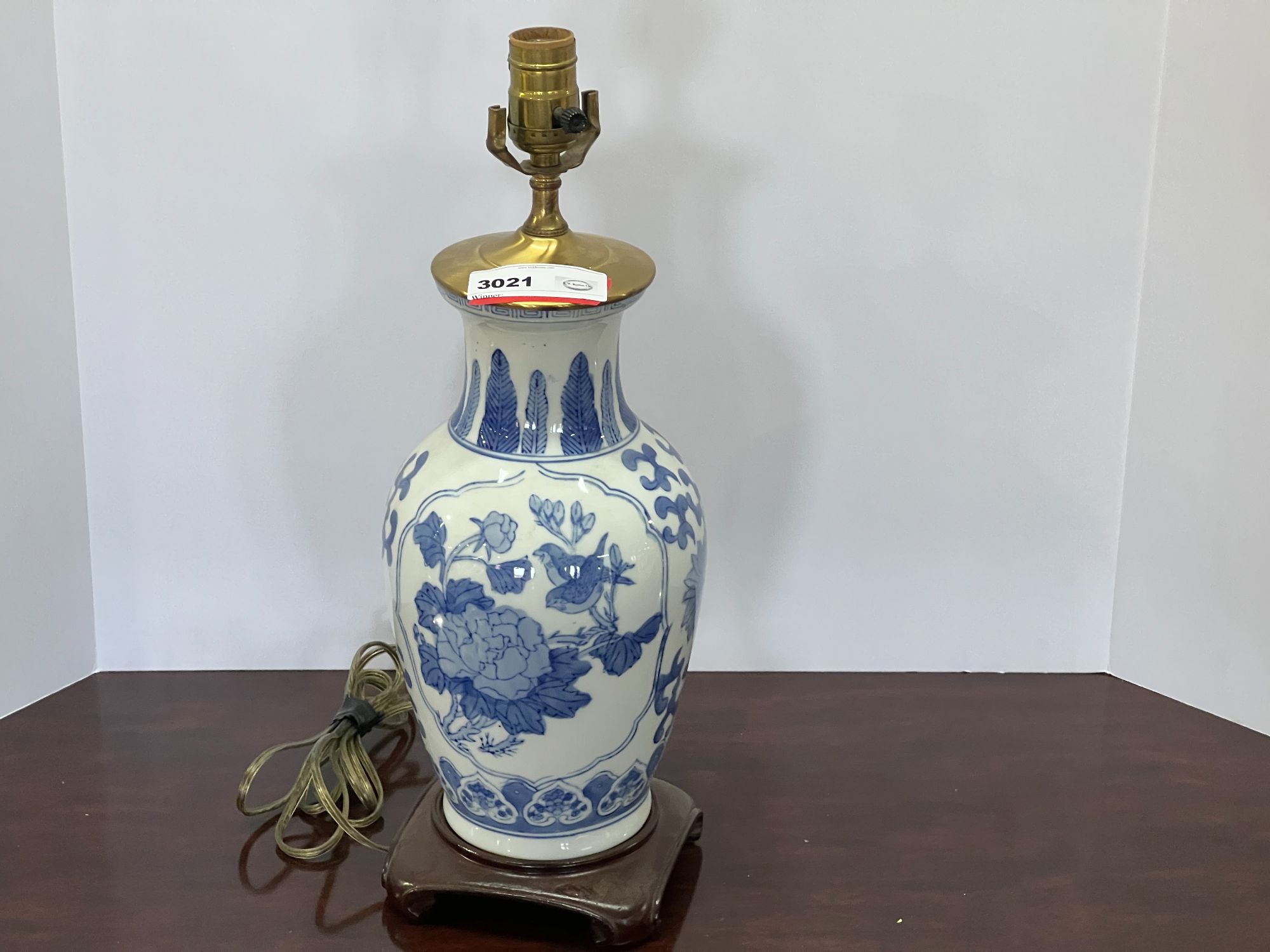 Lovely vintage blue and white porcelain vase lamp with brass accent, see pictures for details.
