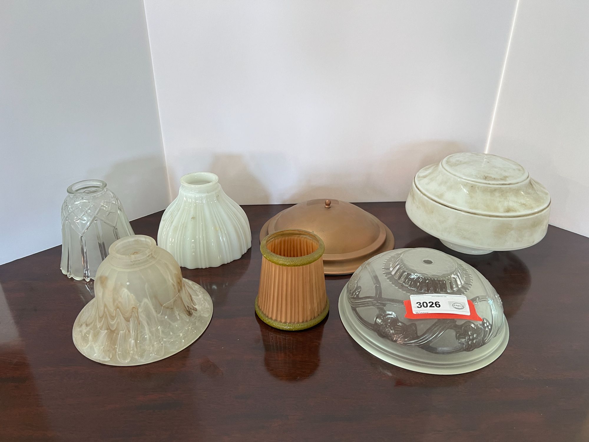 Assorted vintage glass lampshades, includes one metal, seven pieces total, see pictures for details.