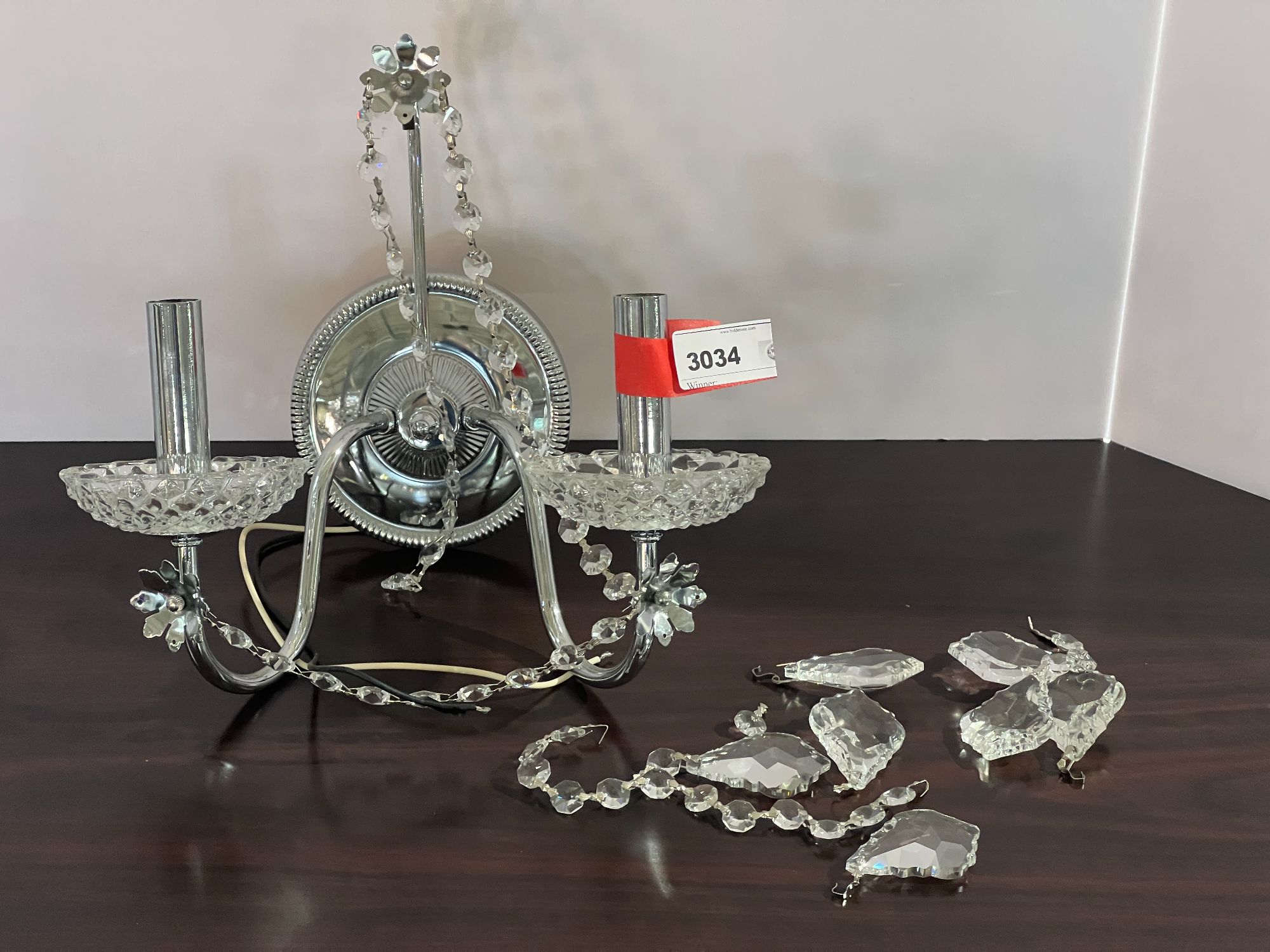 Lovely James R Moder double bulb candelabra sconce chandelier, this decorative piece has lovely glass prisms, please inspect, no guarantee all parts are there, see pictures or details.