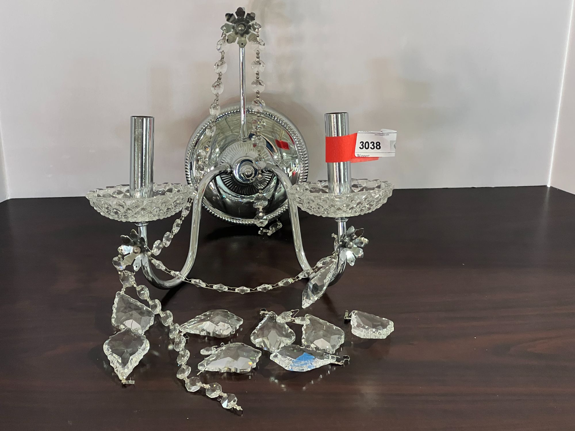 Lovely James R Moder double bulb candelabra sconce chandelier, this decorative piece has lovely glass prisms, please inspect, no guarantee all parts are there, see pictures or details.