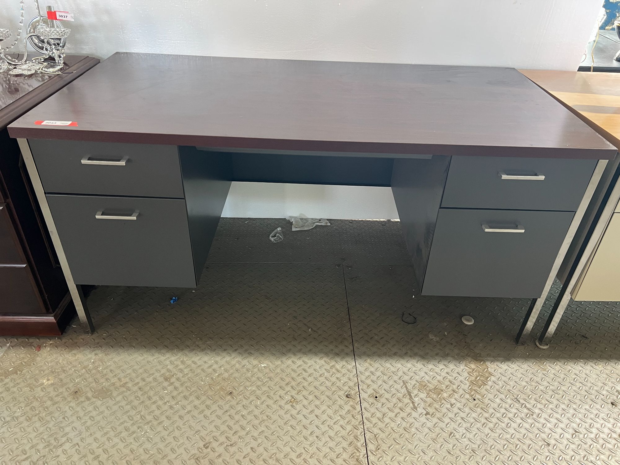 Metal five drawer office desk with wood look top, see pictures for details.
