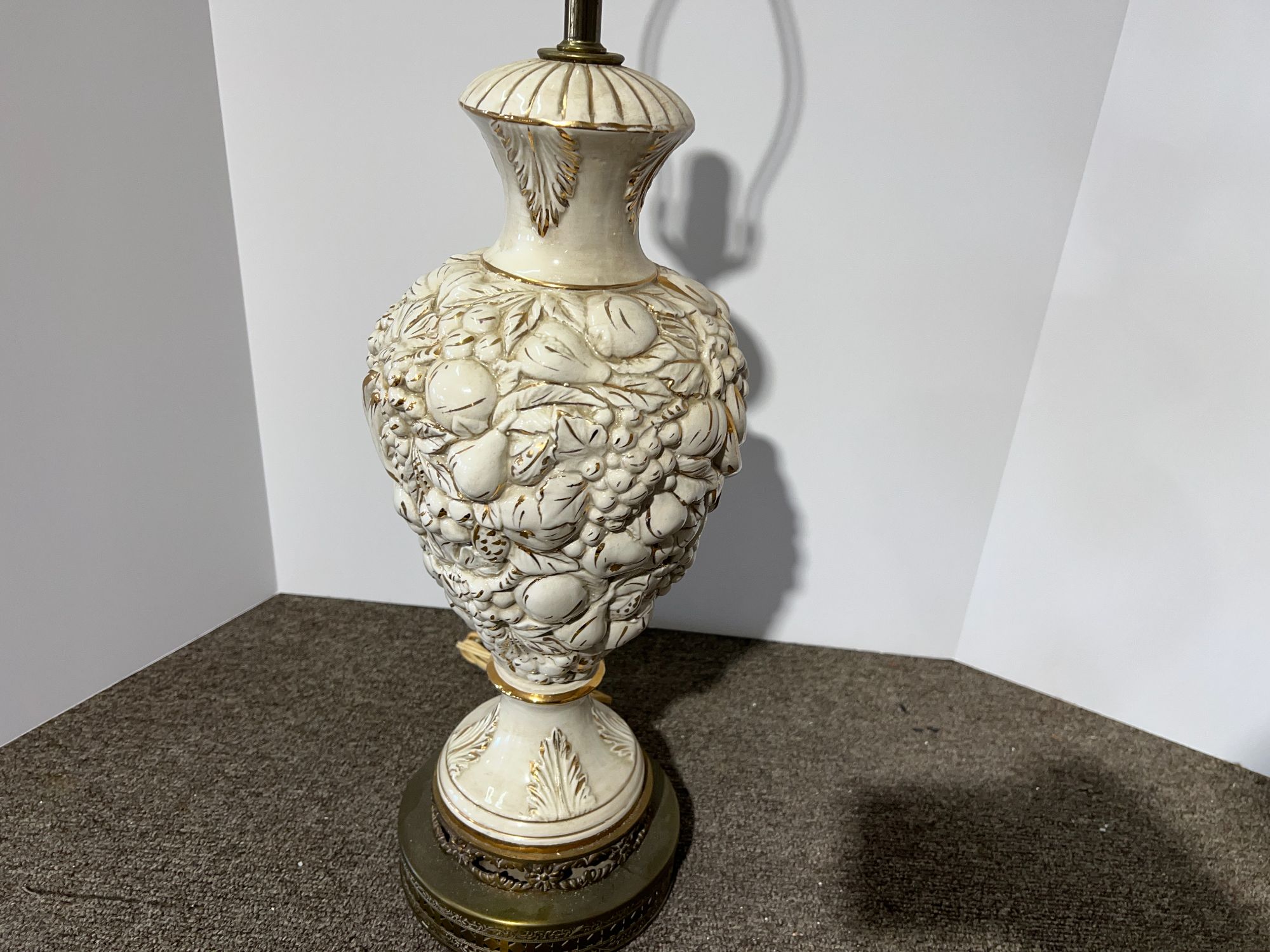 Vintage Capodimonte style porcelain lamp with brass base and gilding, has embossed fruit design, see pictures for details.