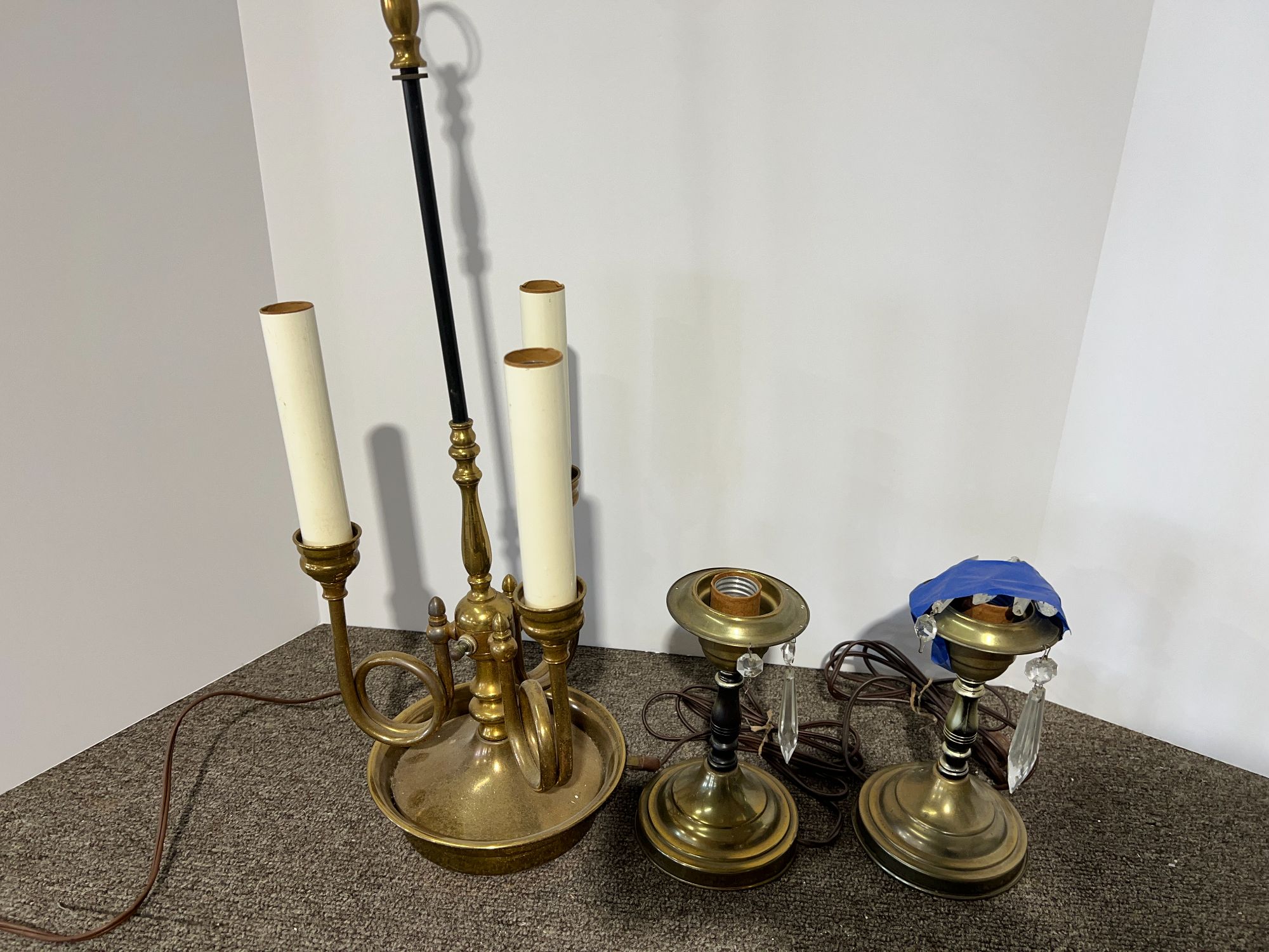 Vintage brass candelabra and candlestick lamps, the candlestick lamps have prisms, some may be missing, three pieces total, see pictures for details.