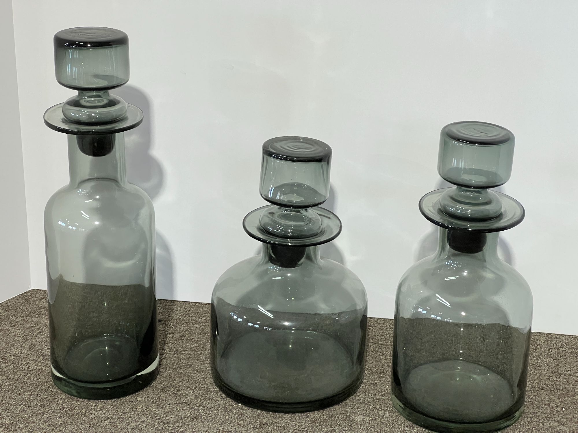 Glass decanters with stoppers, set of three, see pictures for details.
