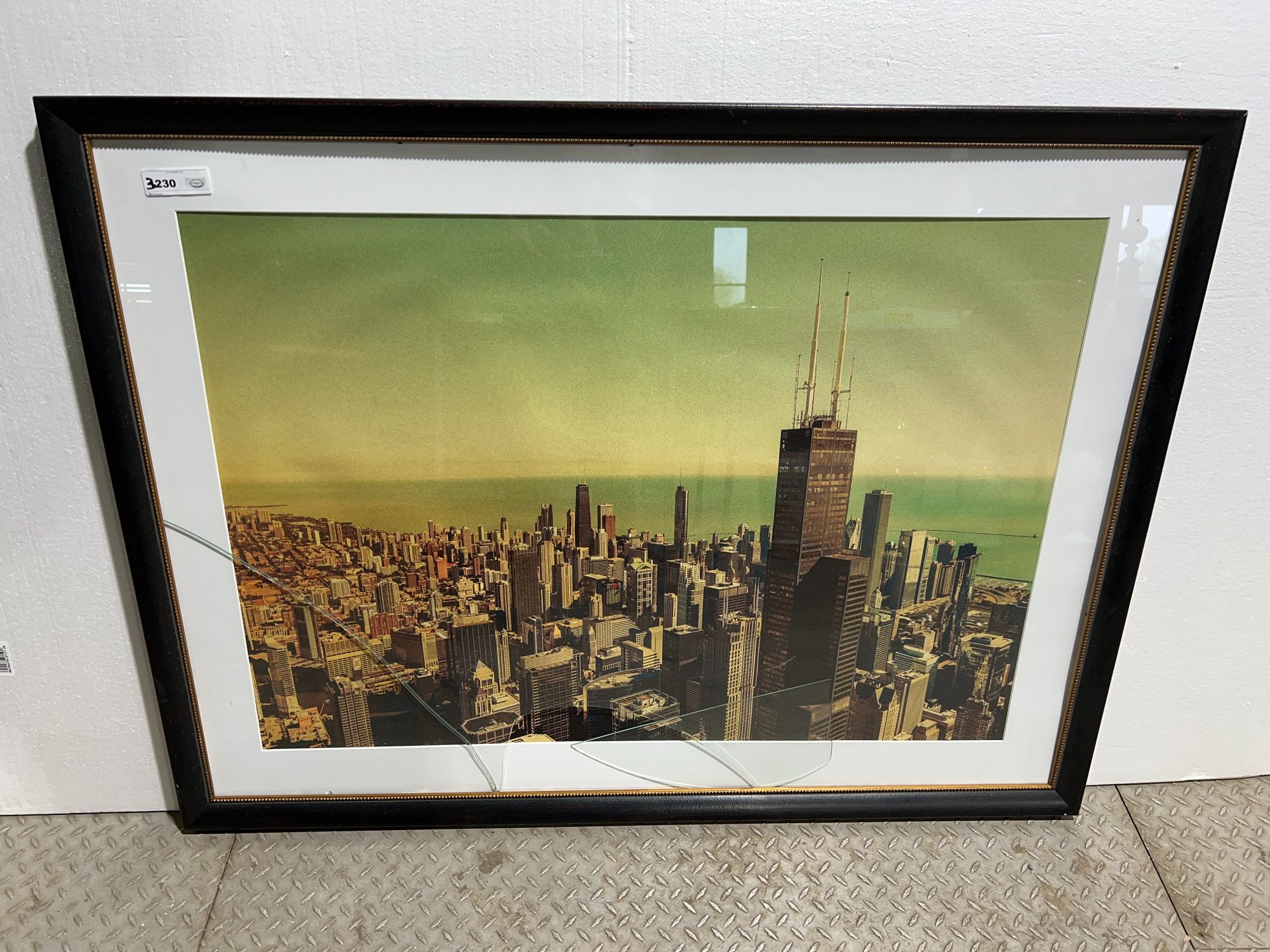 Framed and matted photographic print of the Chicago skyline, the glass is broken in this frame, see pictures for details.