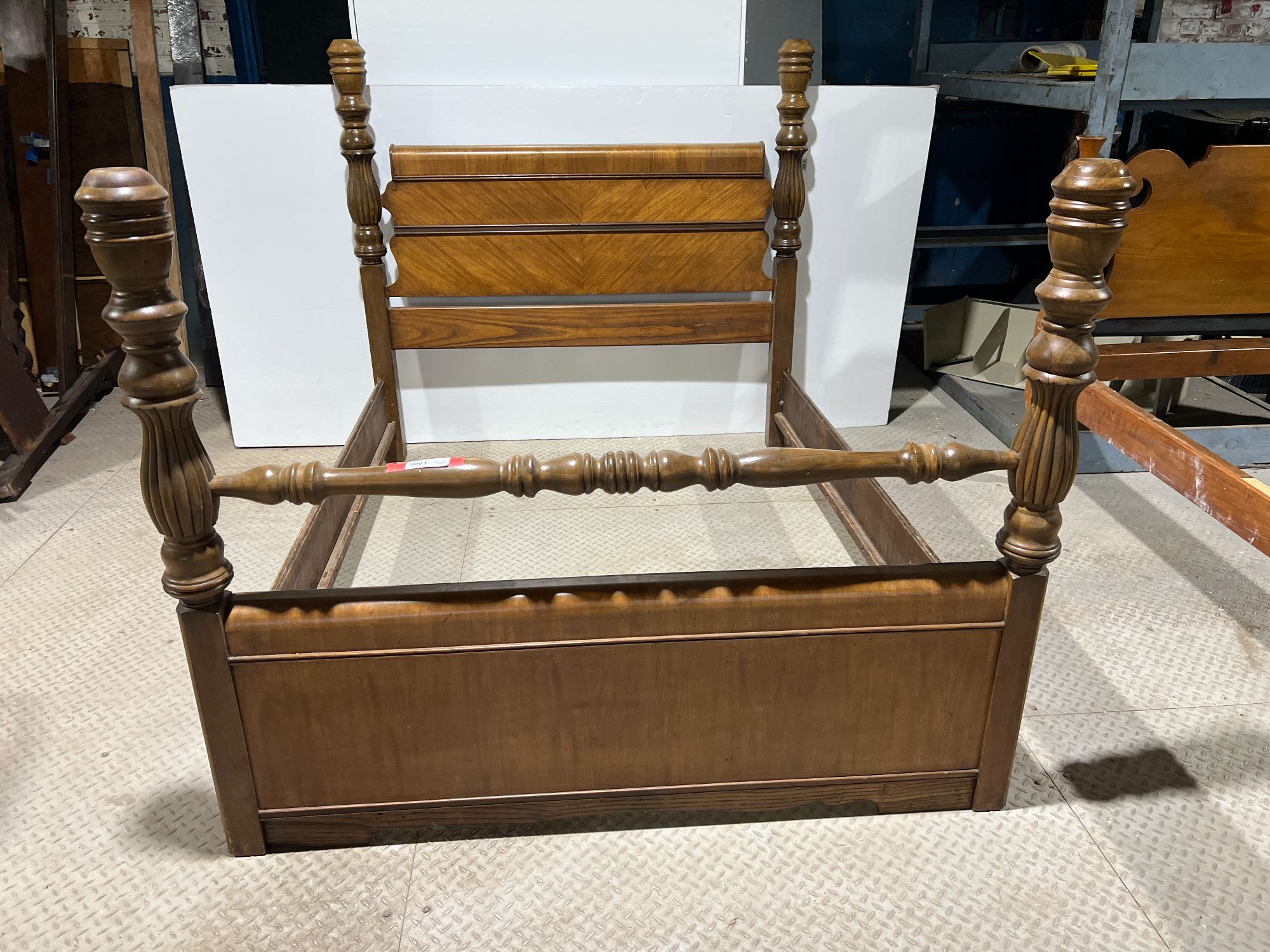 Vintage four poster wood turned bed, comes with side rails, headboard and footboard, has a waterfall look, see pictures for details.