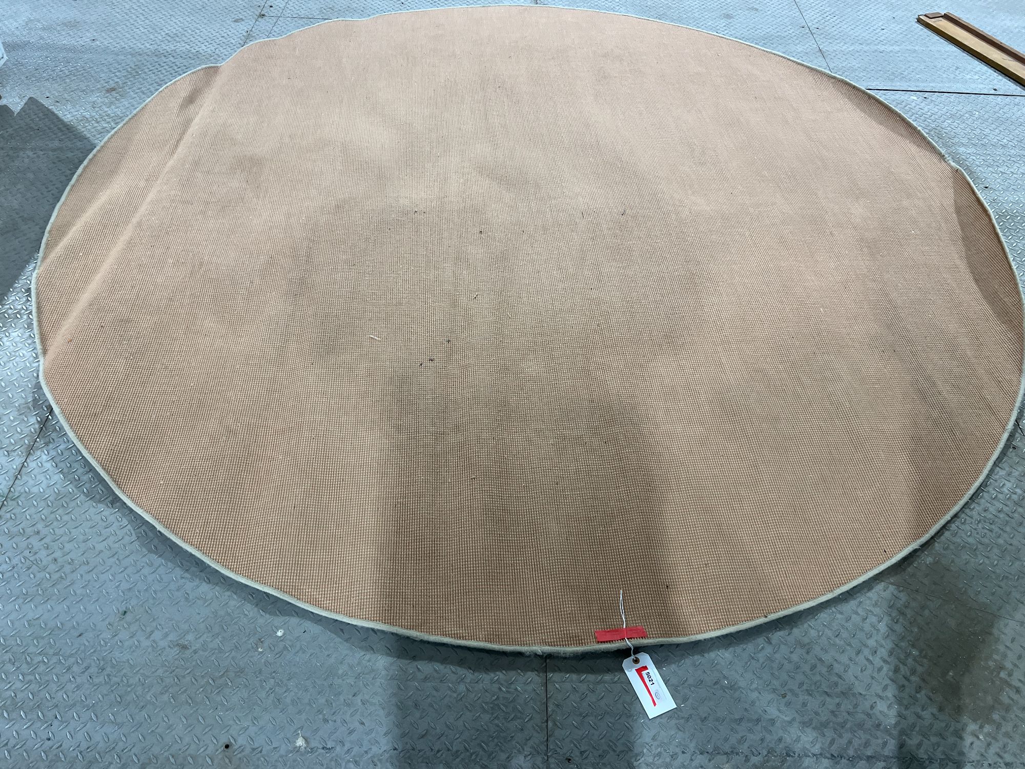Round, 10’ x 10’ area rug, believed to be indoor/outdoor, see pictures for details.