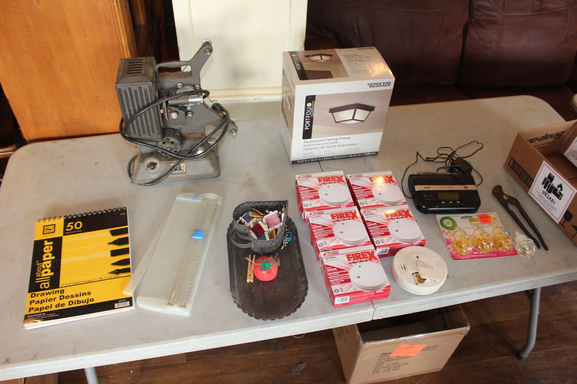 Keystone Movie Project, (5) FireX Smoke Alarms, Air Wick Scent Pods, Paper Trimmer, Channel Lock Pliers, Drawing Paper, and Misc.