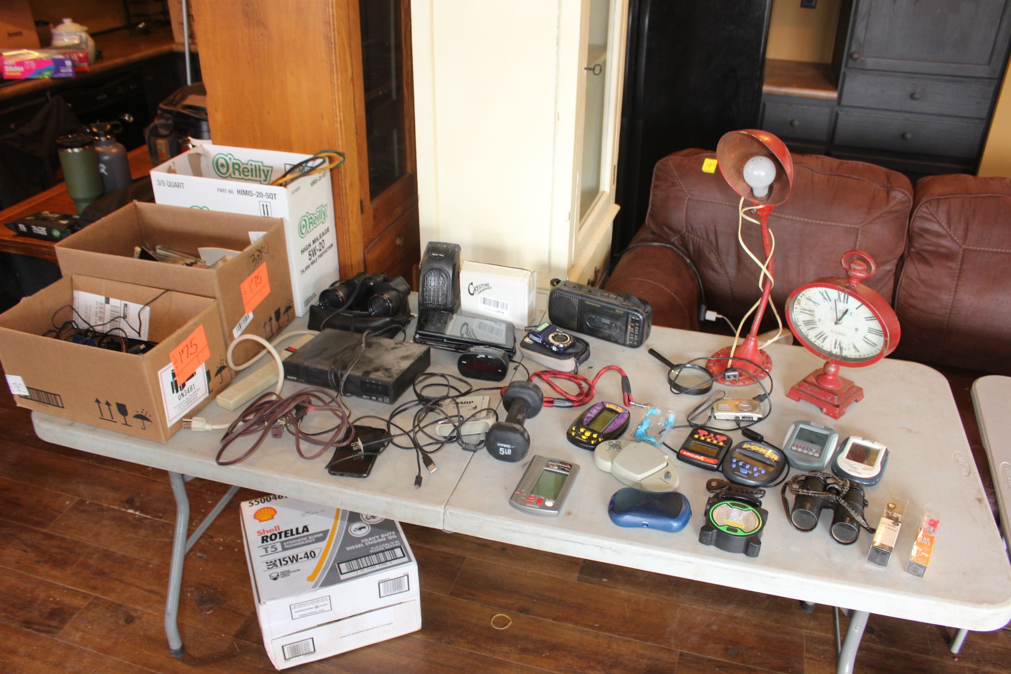 Desk Lamp, Hotel Paris Desktop Clock, Earbuds, Hand Held Board Games, Binoculars, Sanyo DVD Player, Amazon Tablet, Electrical Cords, Power Strips, CDs, Cassette Tapes, and Misc.