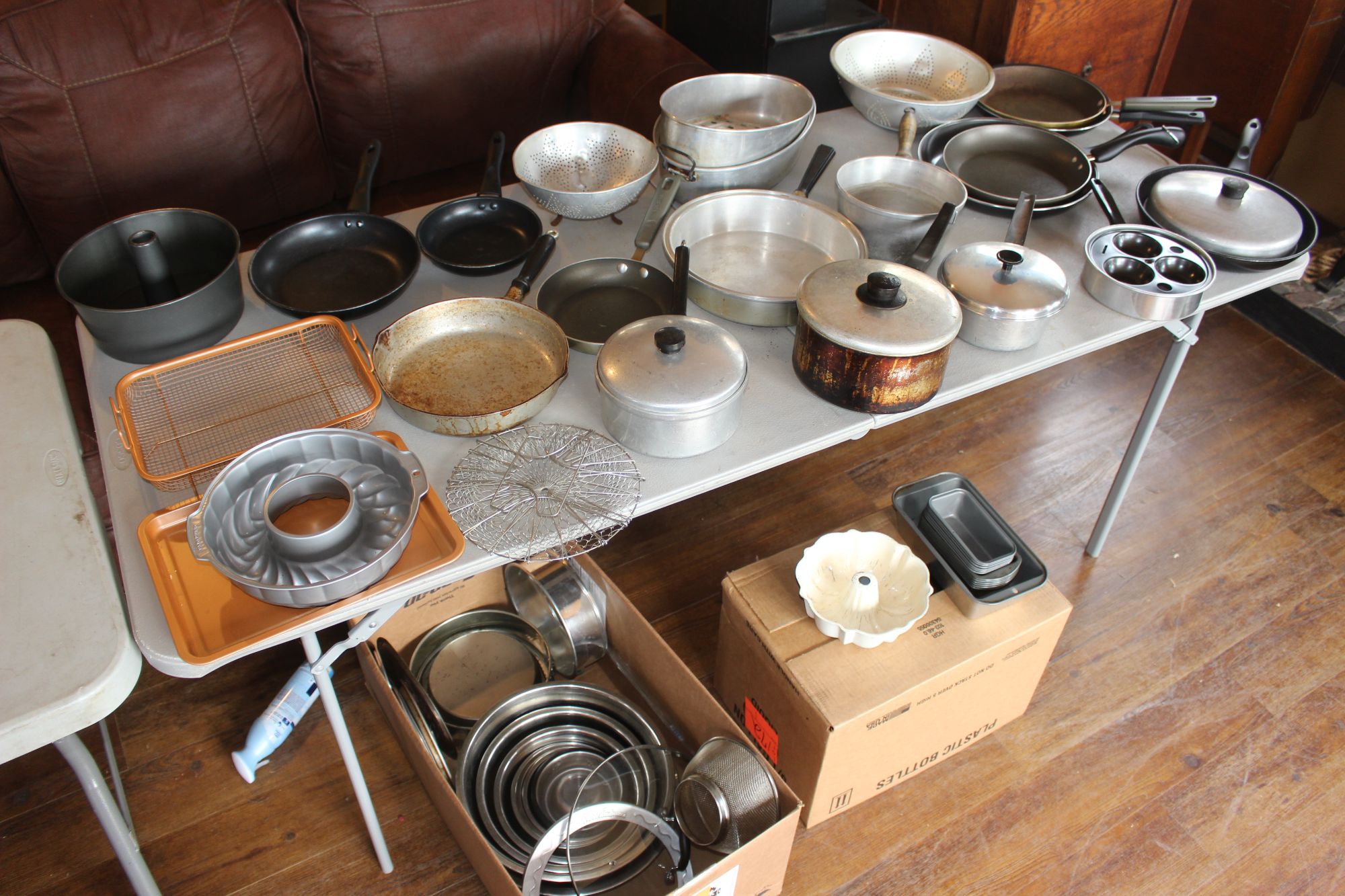 Frying Pans, Roaster Pan, Cake Pan, Pots with Lids, Metal Bowls, Baking Pans, and Strainers