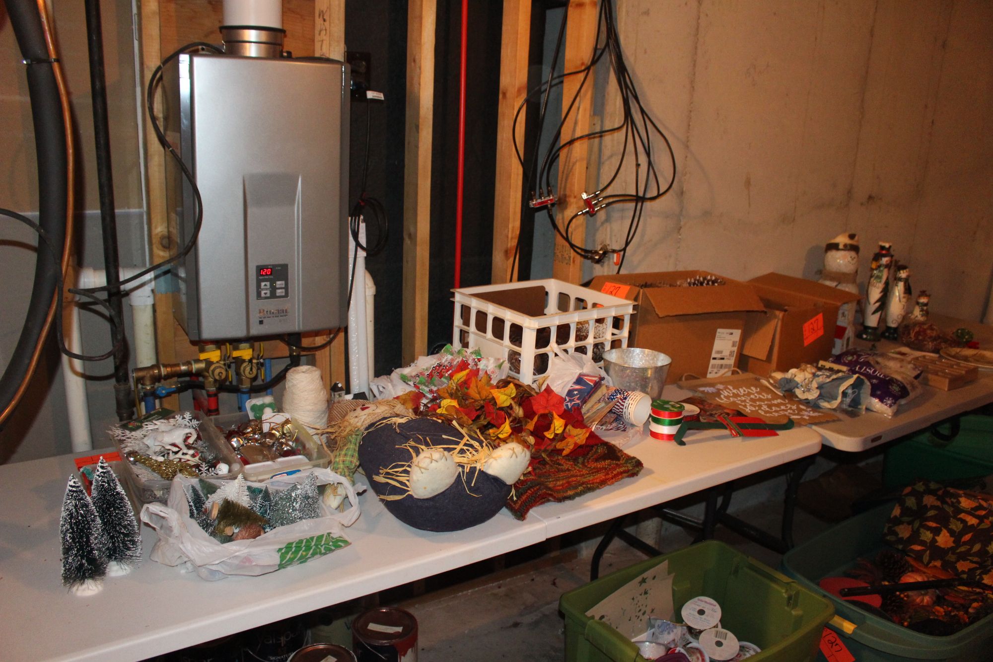 Village Decorations, Pine Cones, USA Plates and Napkins, Ornaments, Bells, Ribbon, Frosty Snow, Snowman Figurines, Thanksgiving Decor, and Misc. Decorations