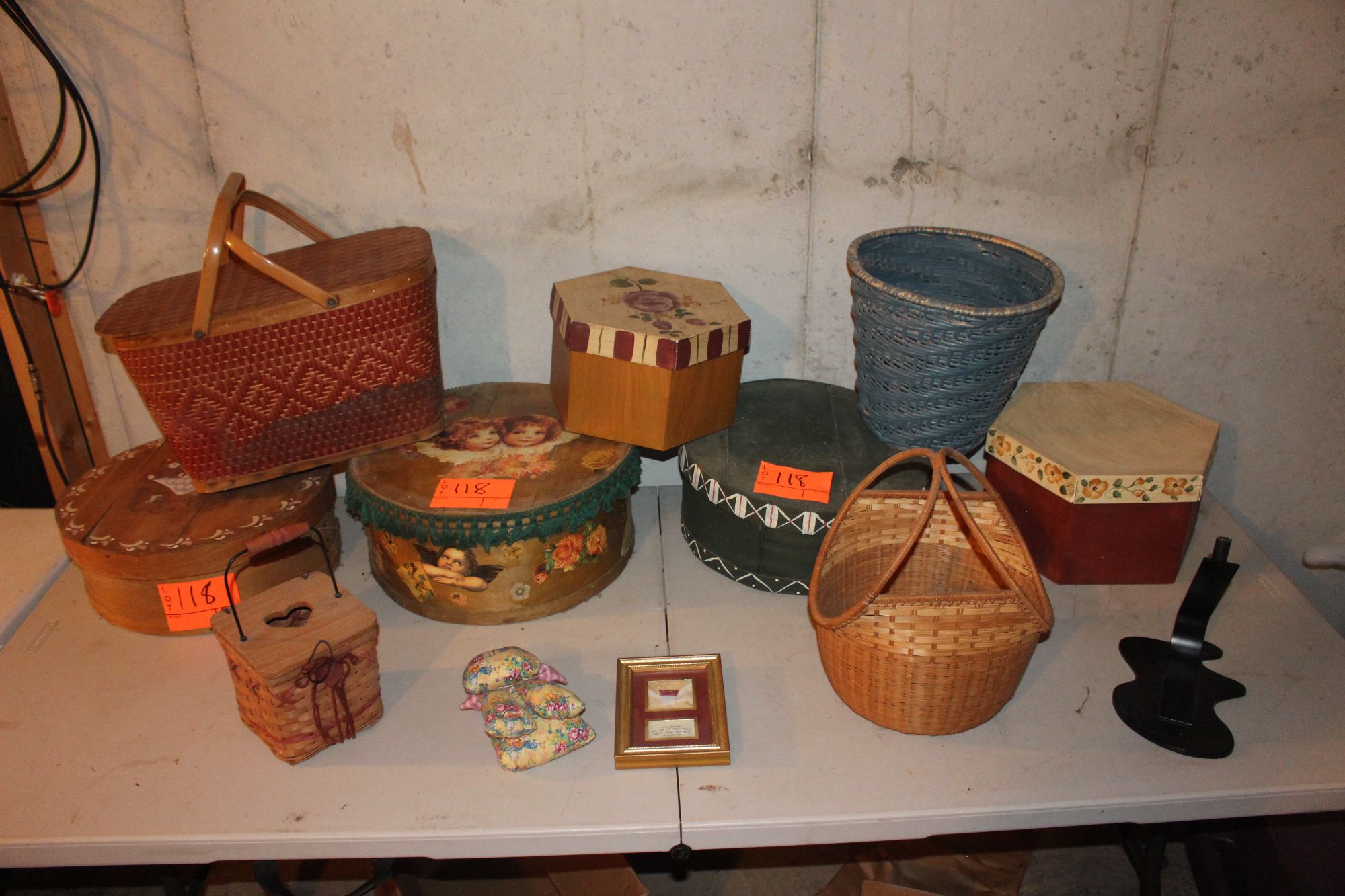 Various Sized Hat Boxes, Cheese Boxes, Wicker Picnic Box, Metal Stand, Pin Pillow, Picture Frame, and Wicker Baskets