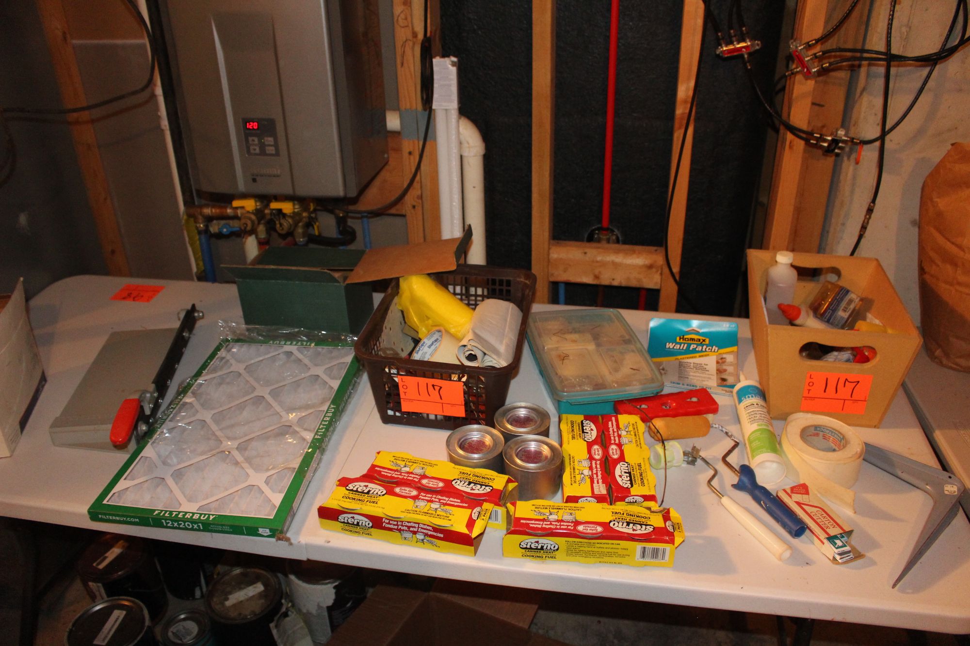 12x20x1 Air Filter, (3) 2 5/8 oz. Sterno Fuel Cans, Paint Rollers, Paper Cutter, Corner Block, Caulk, and Misc.