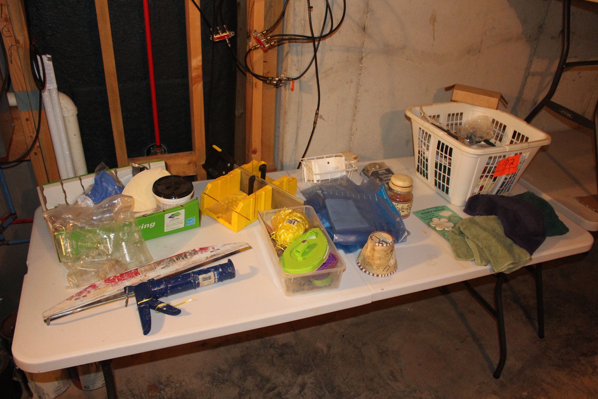 Caulk Gun, Paint Rollers, Glass Bottles, Caulk, Miter Box and Saw, and Misc.