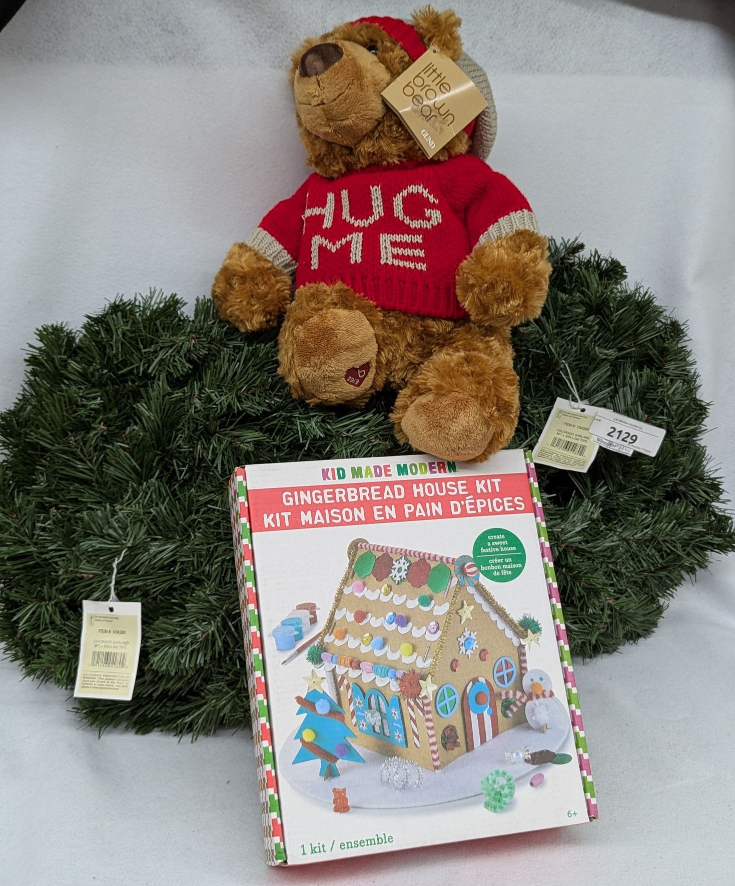 Holiday Decor Bundle: Gund Bear, Garland, and Gingerbread House Kit