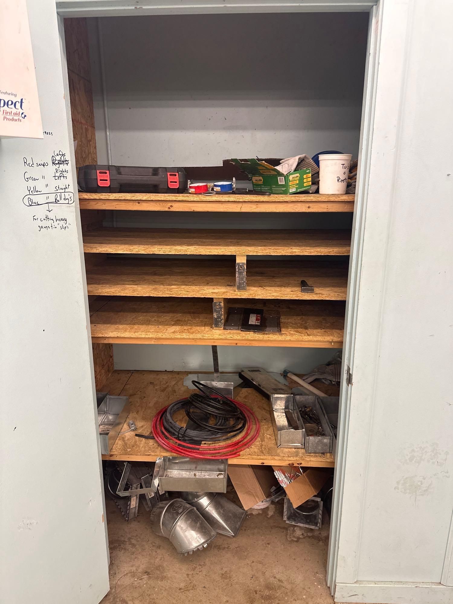 Closet of HVAC Fittings, Tubing, Gauges, Empty Tool Case, Cintas First Aid Kit
